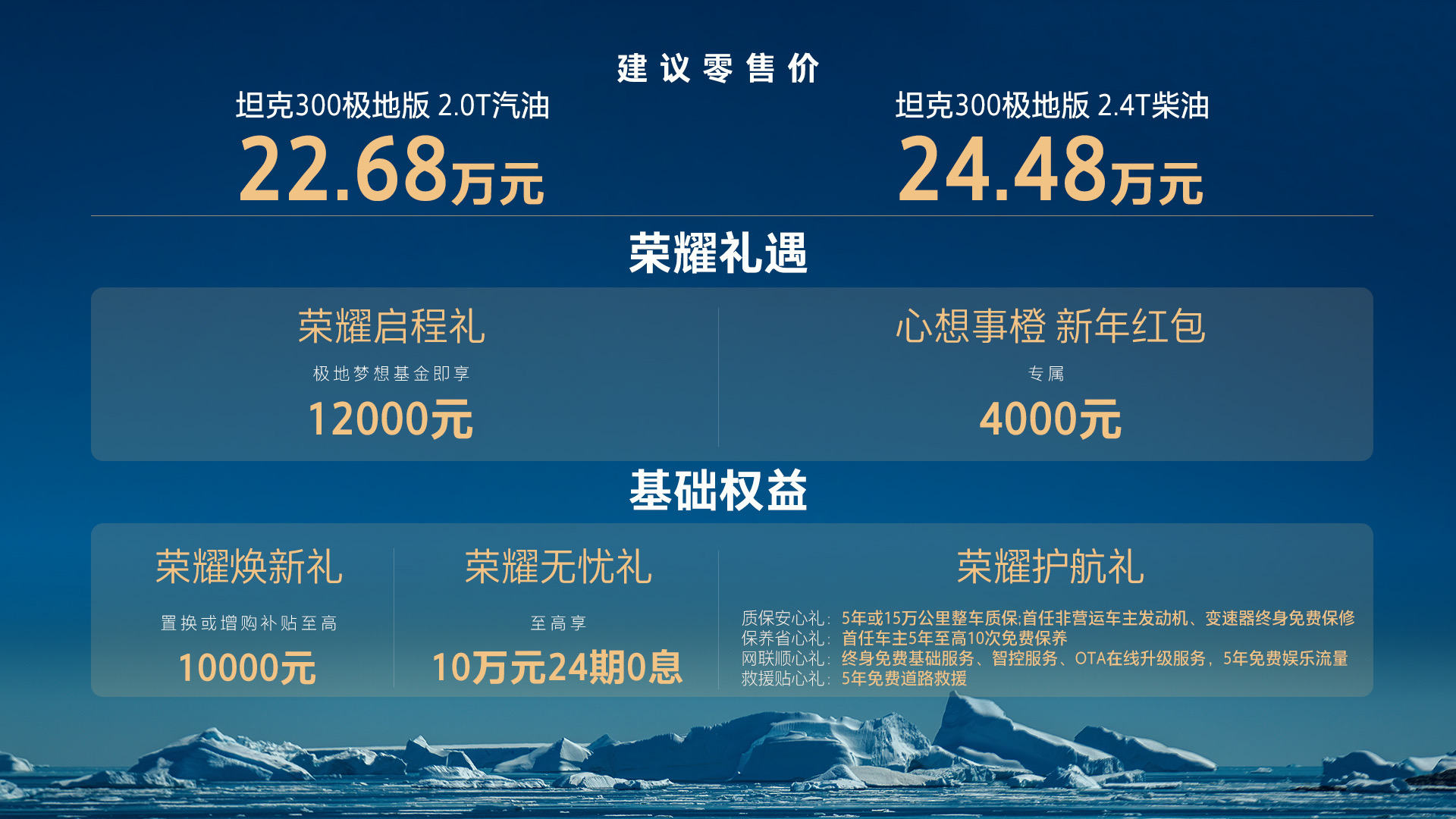 在坦克300全球用户数量达成50万之际,坦克300极地版正式上市。官方建议零售价为:坦克300极地版2.0T汽油22.68万元,坦克300极地版2.4T柴油24.48万元。新车还同步推出荣耀启程礼、心想事橙新年红包和多项基础权益等多重购车礼遇。