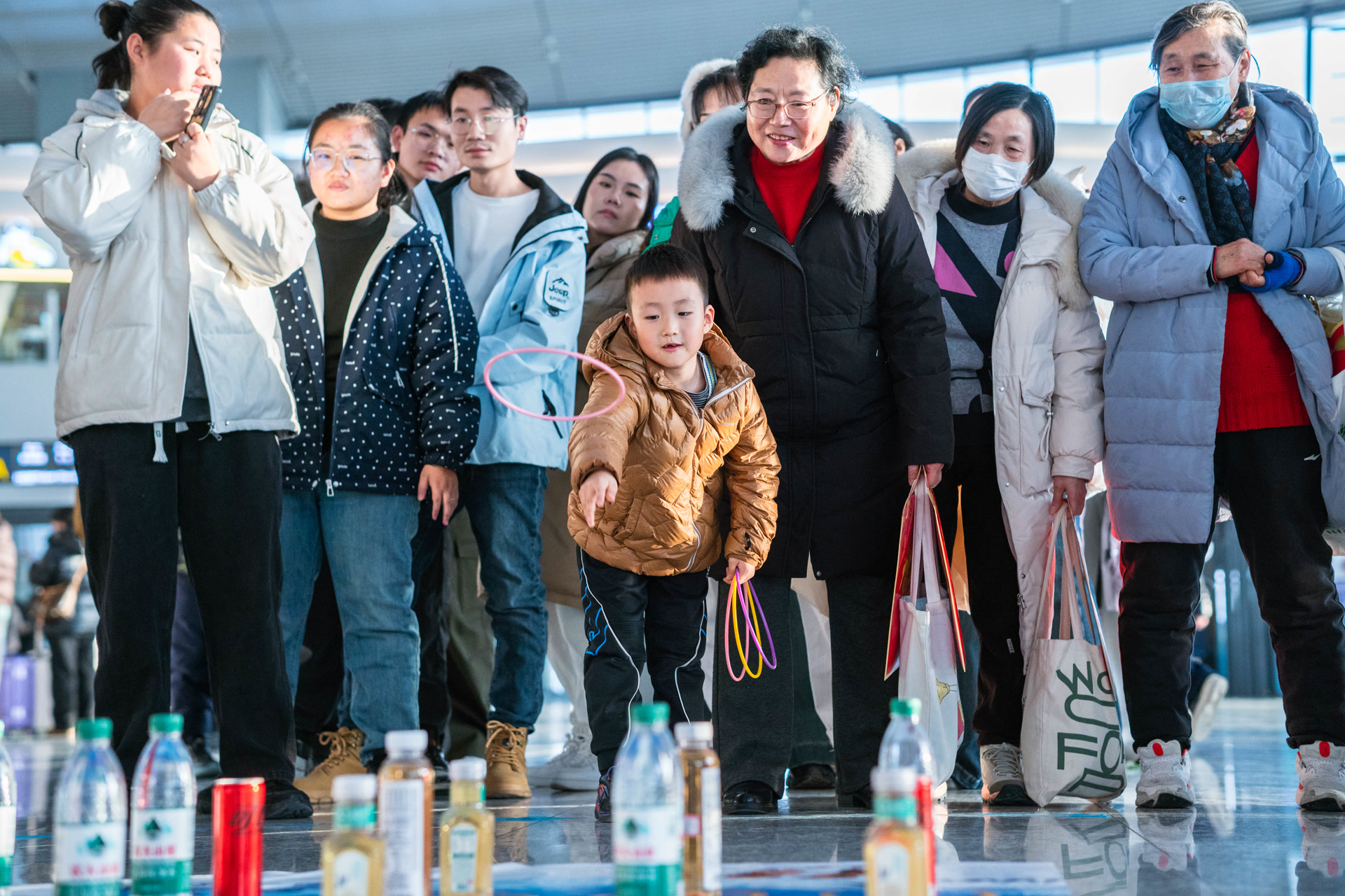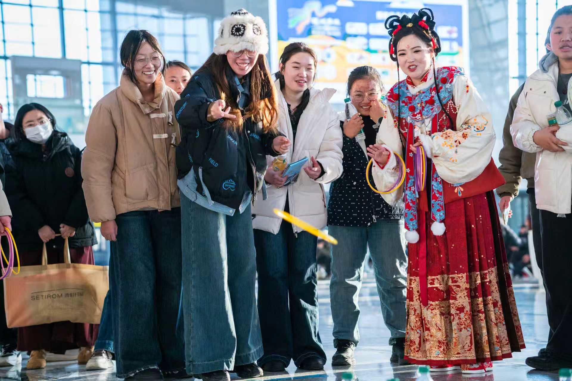 在“财源滚滚”“欢乐套圈圈”“有奖问答”等趣味环节,滑雪票、文创书签、蔚县剪纸等精品奖品受到欢迎。随着主持人抛出问题,不少旅客举手抢答。有奖知识问答环节融合了草原天路、蔚县打树花、冬奥滑雪场等当地特色文旅资源,让旅客在互动中了解张家口的独特地域文化。答对问题的王先生接过纪念礼品后难掩兴奋:“一直想去崇礼滑雪,已经列入计划!”