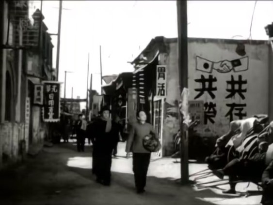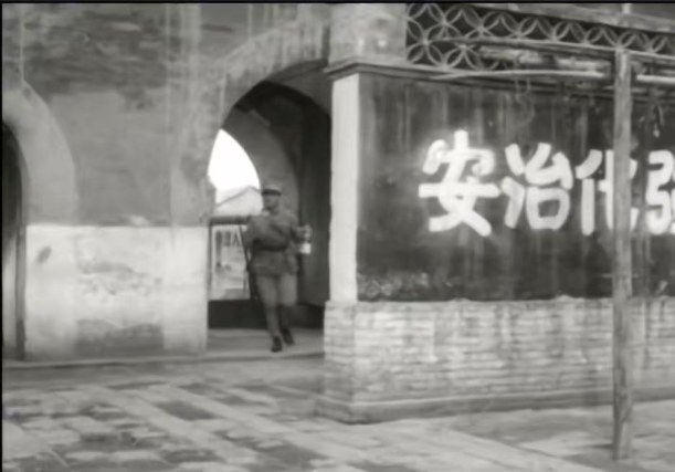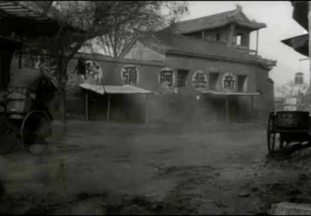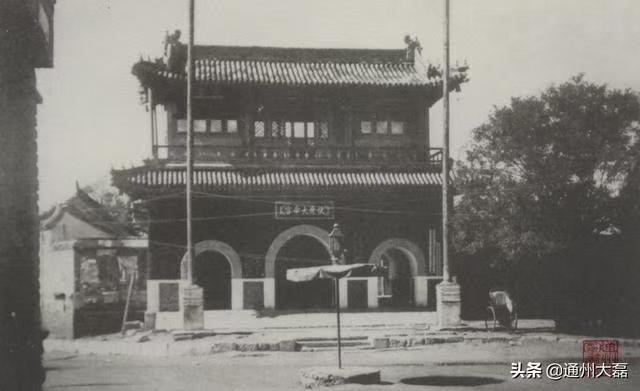 除了南大街,北大街在电影中也占有一席之地。曾经伫立在北大街中部的鼓楼是通州古城内高度仅次于燃灯塔的建筑,虽然现在已经消失,不过《野火春风斗古城》却留下了它最后的影像。从电影截图可见,通州鼓楼上下两层,为了拍摄,上层的歇山式建筑和下层的门楼上都张贴着标语,门楼上还站着持枪守卫的日本兵。