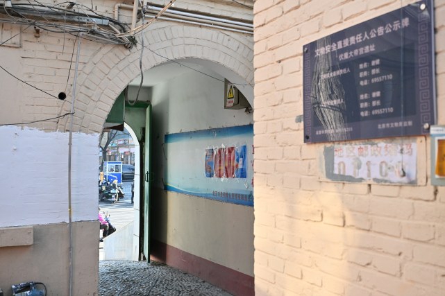 通州区老居民王洲虎给记者展示了一张拍摄于上世纪40年代伏魔大帝宫的山门照片,当时拍摄者站在伏魔大帝宫的山门东侧,就是如今的车站路。山门有两层,一层有三扇拱券门,这与如今物业公司入口的大门很相似,二层则是一座门楼。王洲虎介绍,当时伏魔大帝宫是一座三进制院落,其中前殿和正殿所在的一二进院落就是如今的物业公司,后殿所在的第三进院落如今在其他单位的院中。
