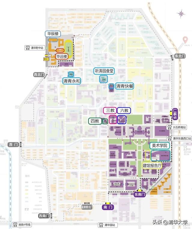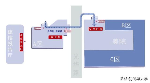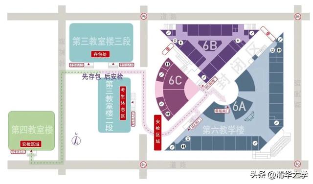 ①考试地点在清华大学校内四教、六教、美术学院的考生:学校的各个门均可入校和出校,其中东南门、东侧门和南门距离考场相对较近(步行约20分钟)。清华大学东南门临近双清路和华业大厦,东侧门临近荷清路和清华大学艺术博物馆,南门临近中关村东路和文津酒店。