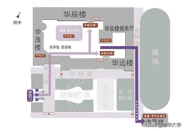 图6 清华附中的存包处、安检通道和考场楼入口示意图