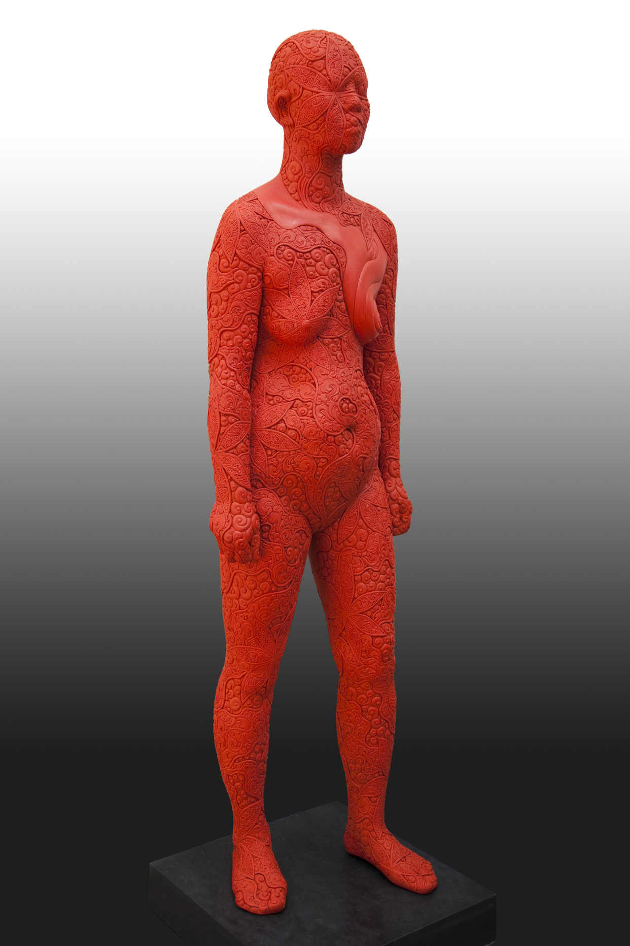 古代雕漆多是平面雕刻,很少创作圆雕。2012年,李志刚历时三年创作出真人大小的圆雕作品《漆母》——一位哺乳妇人的站立雕塑,身上的云纹、卷草纹和车轮状现代纹,代表了雕漆技艺从远古到现代一路走来的历程。灵感源于李志刚与漆农一同采漆时的感触:雕漆之难,不仅是工匠的技艺和时间成本,材料本身也是昂贵的自然馈赠。