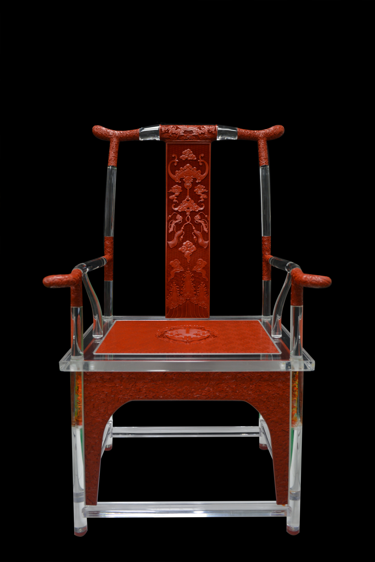 他还大胆尝试科技与传统工艺的结合。在作品《鸿福官帽椅》中,他首次采用3D打印制作胎体,再施以传统髹漆与雕刻,既保留漆质温润,又提升造型精度,为雕漆的现代化应用开辟新径。