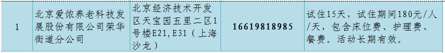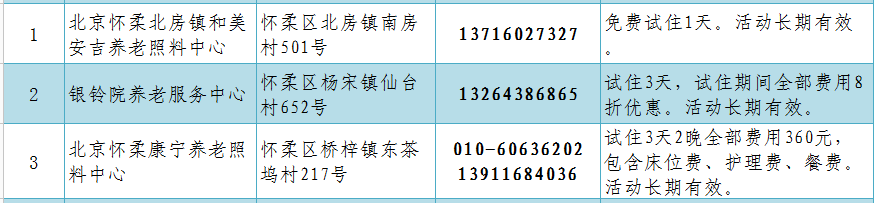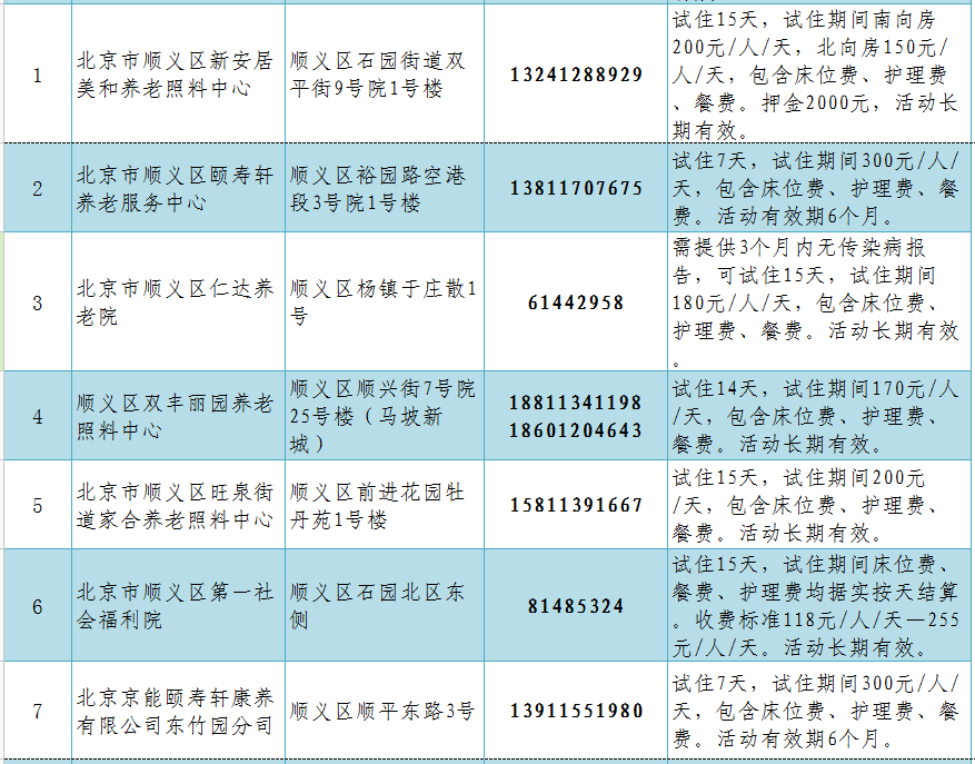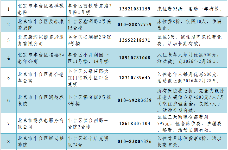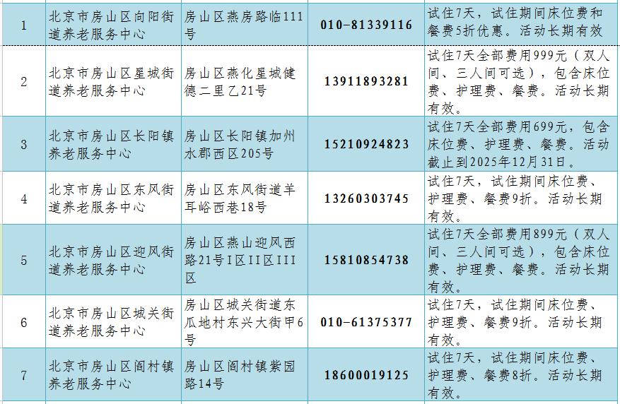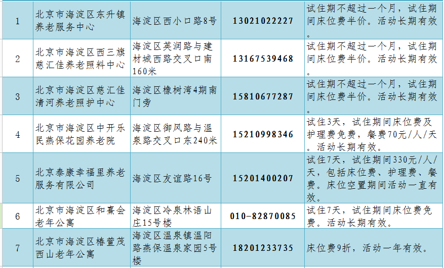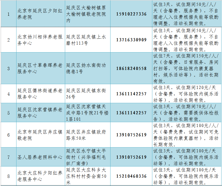 据了解,参与活动的市民可以低价或免费试住养老机构,深度体验养老机构的服务。参与第二批集中开放体验活动的养老机构共有45家,分别位于海淀区、丰台区、石景山区、房山区、顺义区、怀柔区、延庆区和经开区。活动期间,市民可以低价甚至免费试住,试住期为1天到1个月不等。例如在海淀区和熹会老年公寓,市民可试住7天,期间床位费免费;在房山区向阳街道养老服务中心,试住期同样是7天,期间床位费和餐费5折优惠。值得一提的是,大部分养老机构的试住活动长期有效,市民可以根据自身情况选择试住。