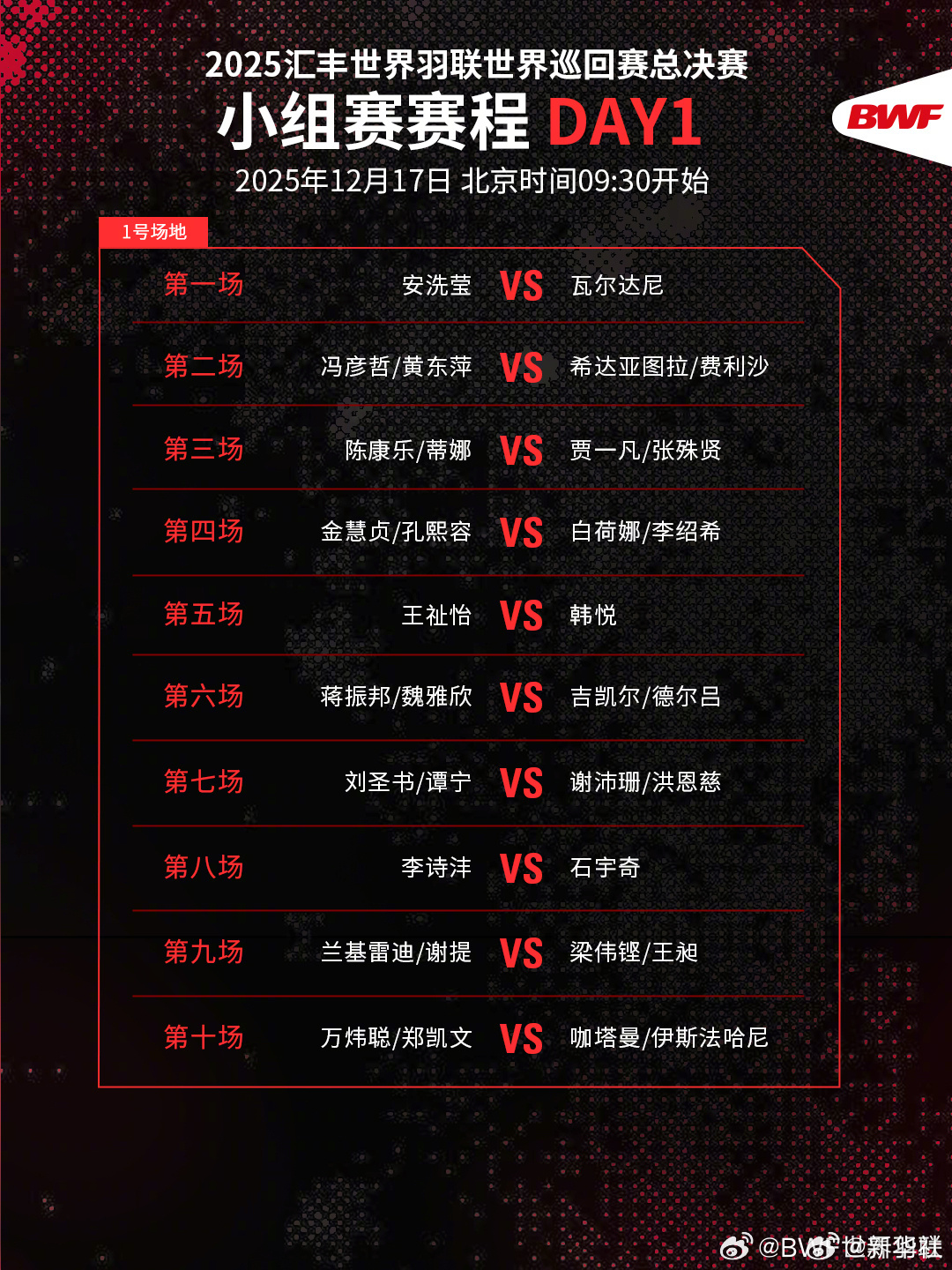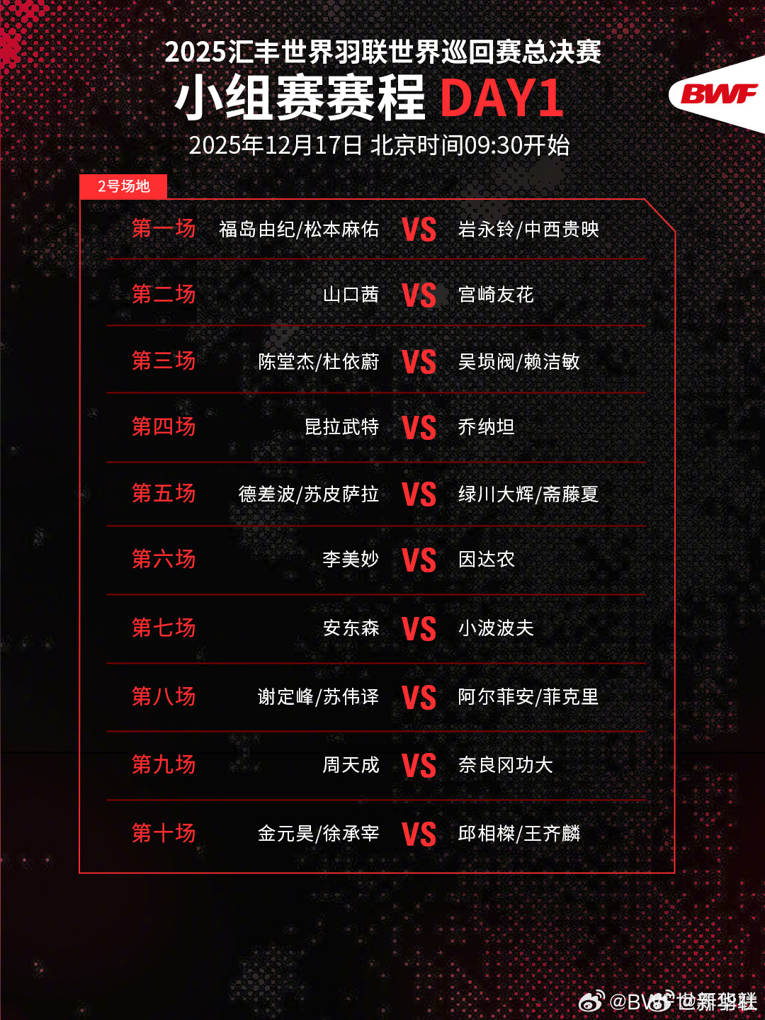 2025年世界羽联年终总决赛将于12月17日至12月21日举行。了解赛程,一起为国羽加油!