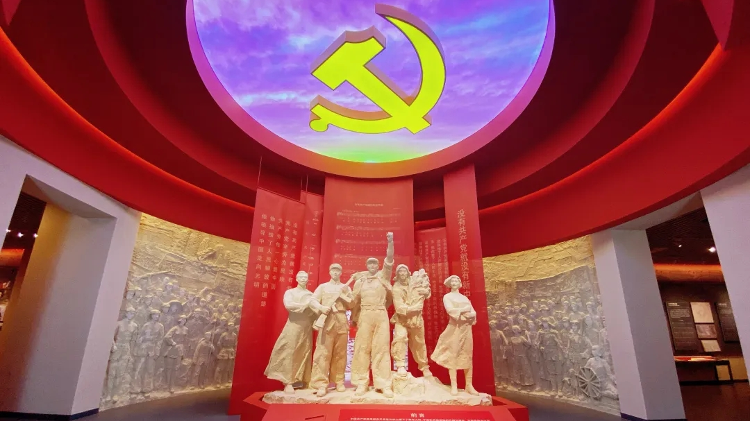 “没有共产党就没有新中国”革命歌曲纪念馆是《没有共产党就没有新中国》歌曲诞生地、全国爱国主义教育示范基地、全国红色旅游经典景区、全国关心下一代党史国史教育基地。馆内设“人民的心声 历史的旋律”主题展,以中国共产党历史为主线,以革命歌曲为载体,依托艺术品创作、大型投影、场景复原、音像展示等方式呈现主题歌曲15首、展示歌曲72首、多媒体链接歌曲123首和84个党史故事,营造出沉浸式观展体验。