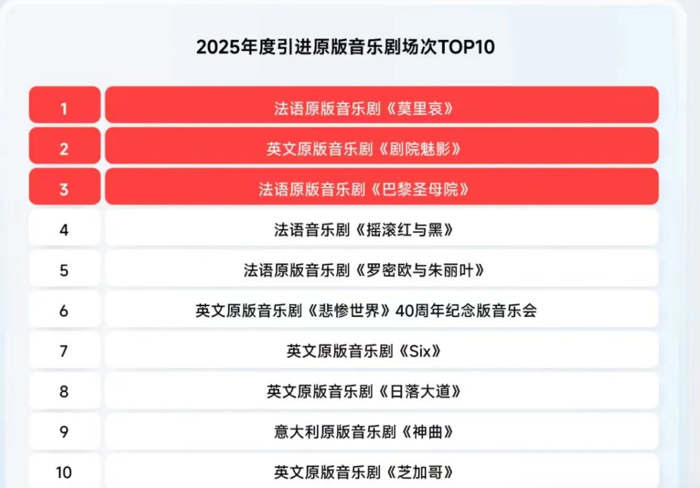 音乐剧是当前国内演出市场增长最快的细分领域之一,2025年音乐剧演出仍居高位。报告显示,原版引进剧目票房收入近10亿元,中文原版音乐剧票房收入达8.79亿元。2025年引进音乐剧市场呈现“精选内容+深度体验”的双轮驱动新格局。法语原版音乐剧《莫里哀》、英文原版音乐剧《剧院魅影》,以及法语原版音乐剧《巴黎圣母院》位列原版引进音乐剧场次前三。