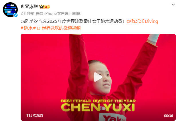 12月16日,世界泳联在官方微博宣布,陈芋汐当选2025年度世界泳联最佳女子跳水运动员。