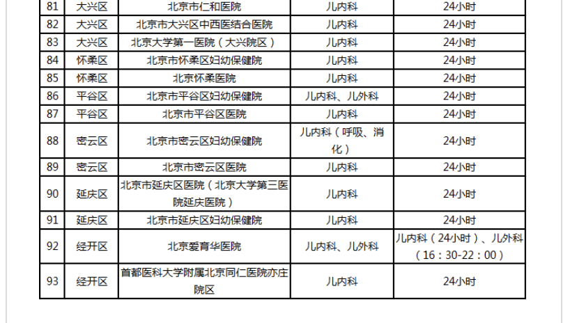 市卫健委日前介绍,方便儿童就近、便捷就诊,北京可提供儿科夜间诊疗服务的医疗机构(含分院区)增加至93家。同时,已开设儿科的妇幼保健机构增加夜间儿科急诊服务供给,目前16个区妇幼保健院均提供儿科夜间诊疗服务。其中,西城区、朝阳区、海淀区、石景山区儿科服务时间为8时至20时,东城区、门头沟区儿科服务时间为8时至22时,其余各区均提供24小时儿科服务。该委表示,医疗机构会依据诊疗实际状况对儿科门急诊服务的范围和时间进行动态调整,以满足服务需求。