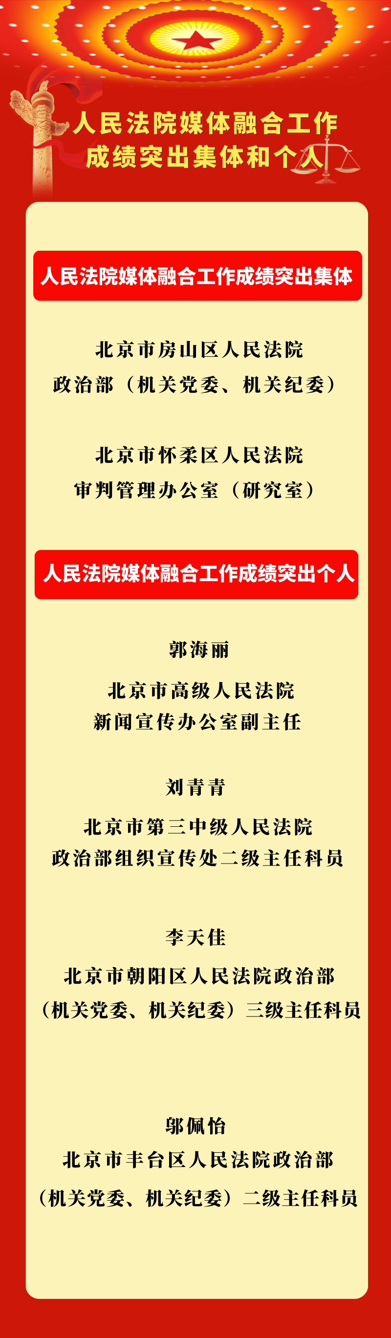 其中,北京市房山区人民法院政治部(机关党委、机关纪委)、北京市怀柔区人民法院审判管理办公室(研究室)获人民法院媒体融合工作成绩突出集体;北京市高级人民法院新闻宣传办公室副主任郭海丽、北京市第三中级人民法院政治部组织宣传处二级主任科员刘青青、北京市朝阳区人民法院政治部(机关党委、机关纪委)三级主任科员李天佳、北京市丰台区人民法院政治部(机关党委、机关纪委)二级主任科员邬佩怡获人民法院媒体融合工作成绩突出个人。