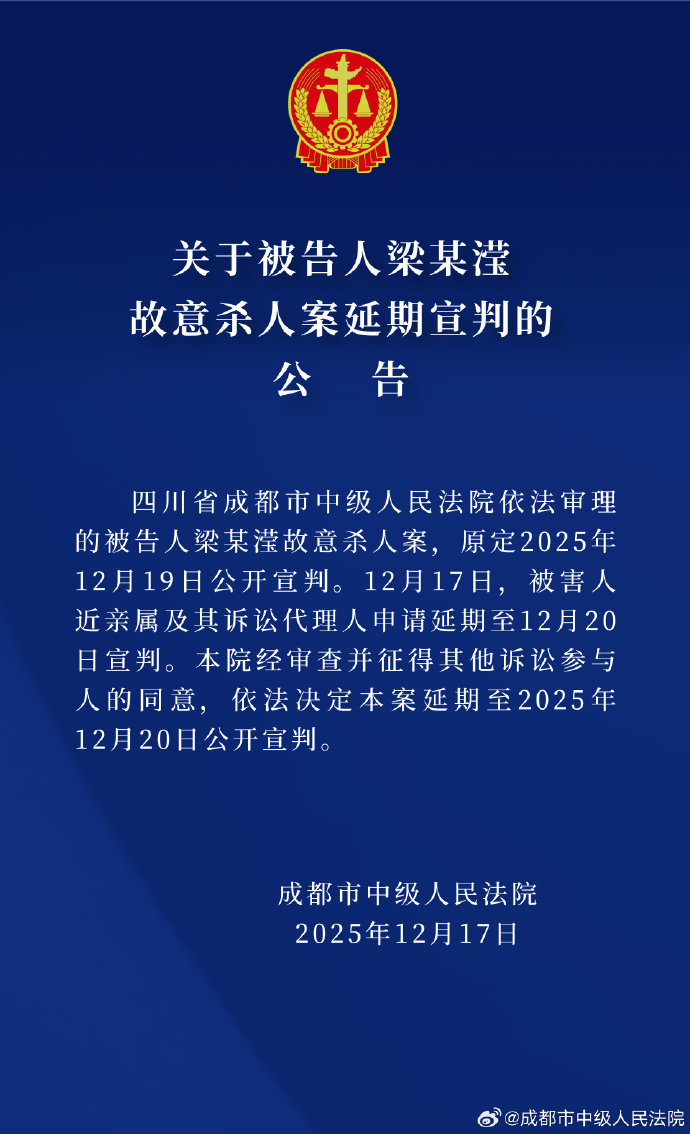 成都市中级人民法院:梁某滢故意杀人案延期宣判