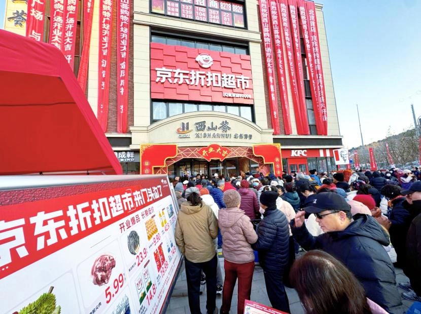12月17日,京东折扣超市北京首店在门头沟西山荟开业。自清晨起,门店外便排起长队,5.99元一斤的猪前尖肉、23.9元一斤的鲜活海白虾、9.9元一托的鲜鸡蛋等“爆款”商品吸引了不少市民前来选购。
