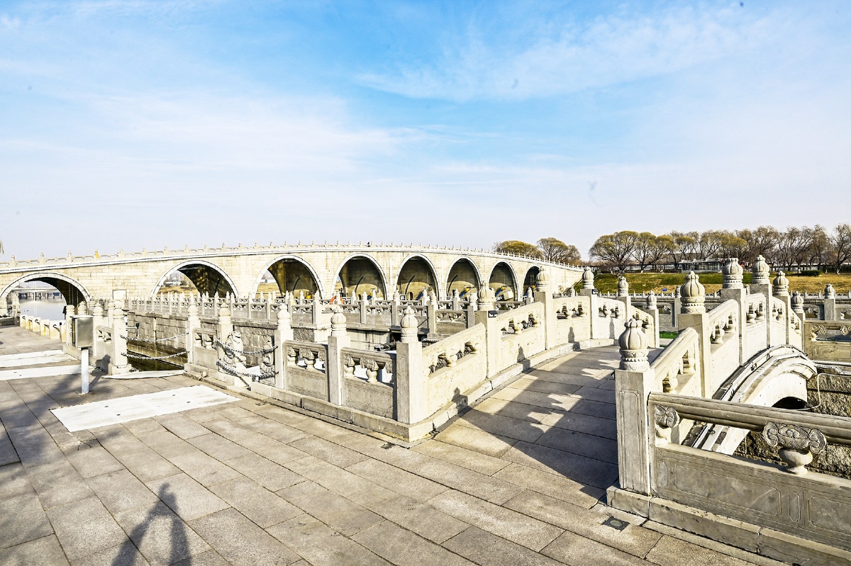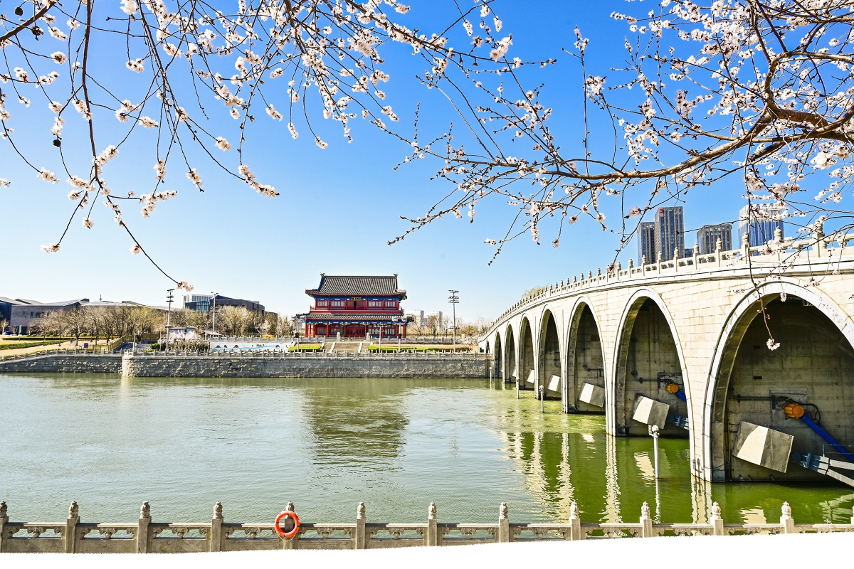 在千荷泻露桥上向北望去,大光楼边上的那座古朴石桥便是北关分洪枢纽的新拦河闸。曲一介绍,新拦河闸采用闸桥合一设计,在设计之初,就充分考虑到与历史文化相结合,借鉴颐和园十七孔桥的设计思路,采用中国拱形多孔桥的造桥艺术修建。闸室共7孔,将闸门隐于桥下椭圆形的桥洞中,远看是桥,近看为闸,避免了以往启闭机式水闸工作桥过高阻挡视线的不足。由于建设在历史上的石坝码头处,所以这个桥又叫“石坝桥”。为减少工程痕迹,控制闸门的液压结构均通过地下廊道进入大光楼。同时,在拦河闸桥西还增设了一个船闸,未来游船可经此通行,直观见证大运河京冀段水道的复苏。