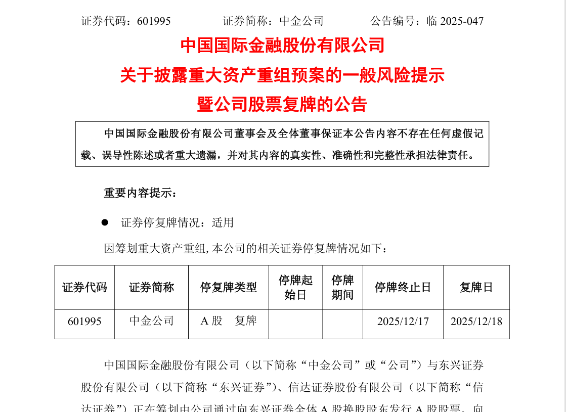 券商重磅重组方案出炉。12月17日晚,中金公司与东兴证券、信达证券同步披露重大资产重组预案,中金公司换股吸收合并两家公司迎来重大进展,并拟于12月18日复牌。