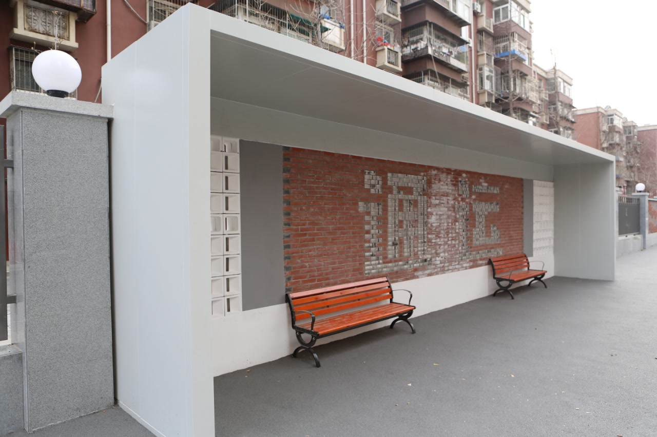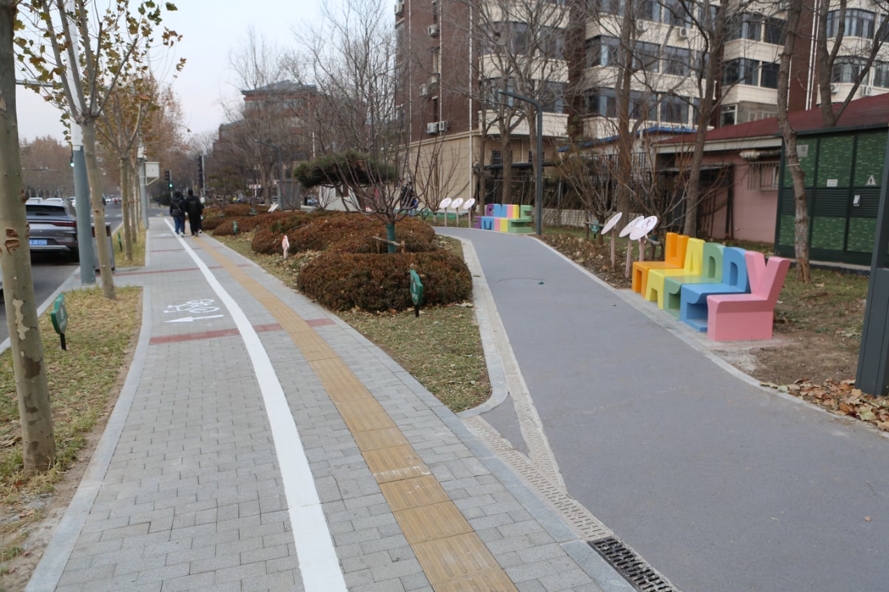 在通州区妇幼医院门口,过去这里只有简单绿化,缺少缓冲休息区,人流量大、排队人员密集、拥堵杂乱是常态。通过本次改造,项目施划了非机动车停车区,利用原有绿地嵌入口袋公园,增加休憩互动设施,公园道路使用塑胶软性铺装,丰富原有绿化层次,大大改善了原有拥堵杂乱状态。