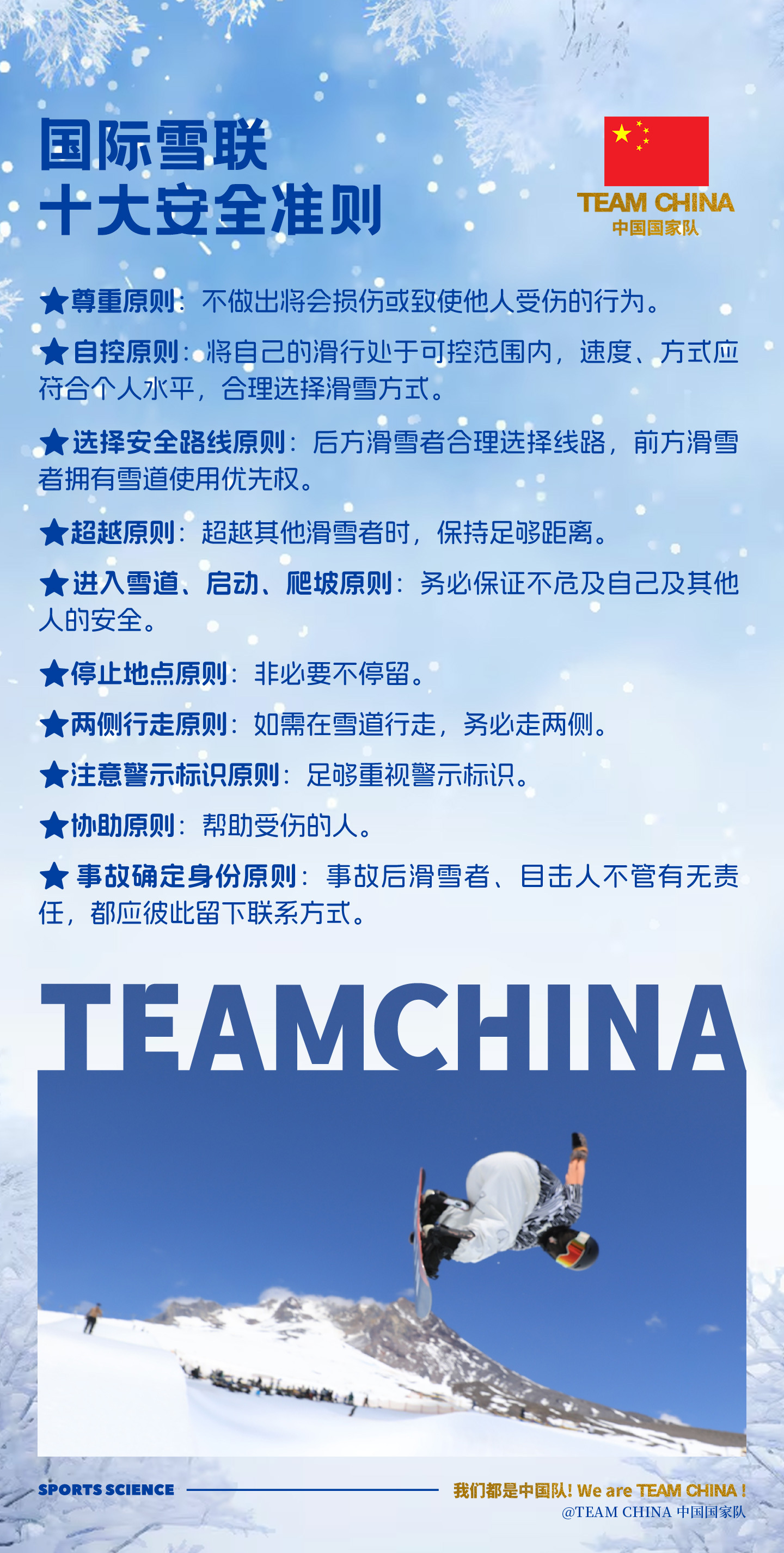 牢记国际雪联10条安全准则,尊重他人,控制速度,选择安全路线,助力每位雪友平安畅滑!