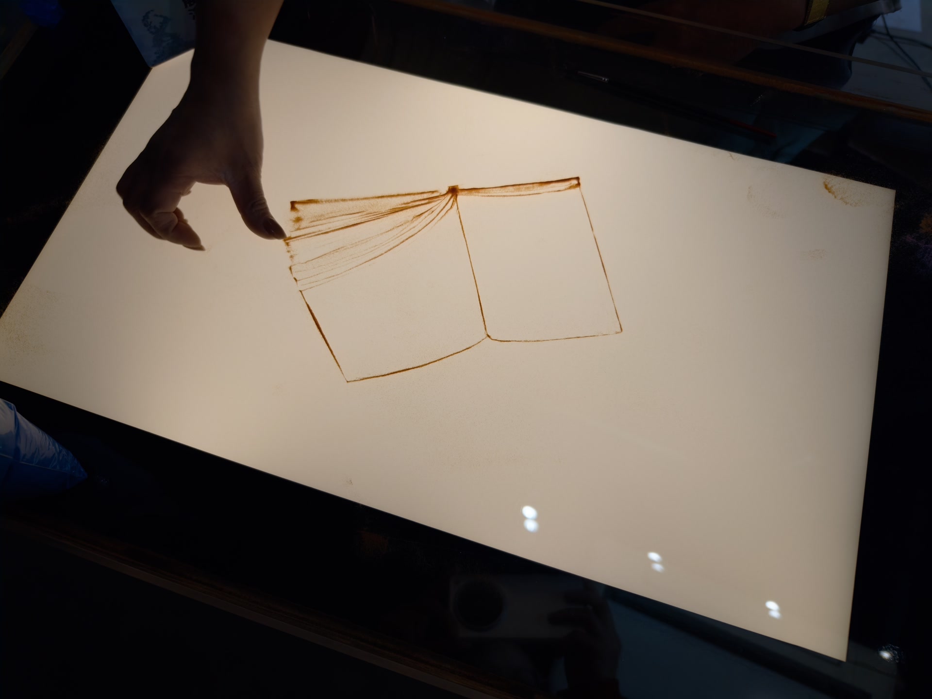 “为了给孩子们留足想象的空间,沙画画面不宜过于具体,但又必须精准匹配戏剧节奏与音乐节拍,难度确实很大。”王楠坦言,由于本次演出所有的沙画绘制均为原创,配合每首曲子、每一个情节的动画都需要全新的创作构思。而沙画的创作逻辑往往是“反向推演”,如果最终定格的画面是幽深的山谷,王楠就必须思考,如何将所有视觉元素在沙画箱中依次展开、自然转换,汇聚成最终场景。