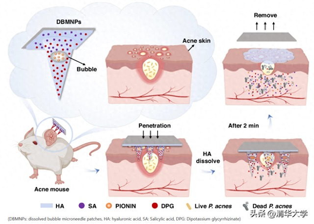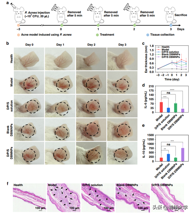 研究团队通过建立小鼠耳部痤疮模型,系统探究了其在痤疮治疗中的功效。实验结果表明,载药的DBMNPs显著优于传统外用药液组,其生物相容性良好,能够显著降低痤疮部位促炎因子IL-6,提升抑炎因子IL-10的表达,使用三天后几乎完全清了除病灶部位的痤疮丙酸杆菌,具有良好的痤疮治疗效果。