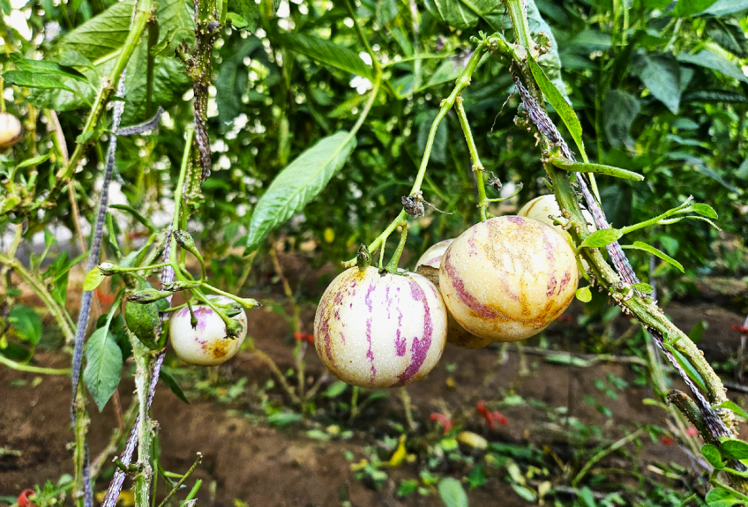 经过八个月精心培育,目前两种水果均已进入成熟期。黄金百香果的藤蔓爬满整片支架,沉甸甸的果实把藤蔓压得微微下垂;前期检测显示,其果实甜度已达到18.6°Brix(白利度);人参果则一个个挂在枝桠间,果皮上的紫色条纹清晰分明,长势喜人。