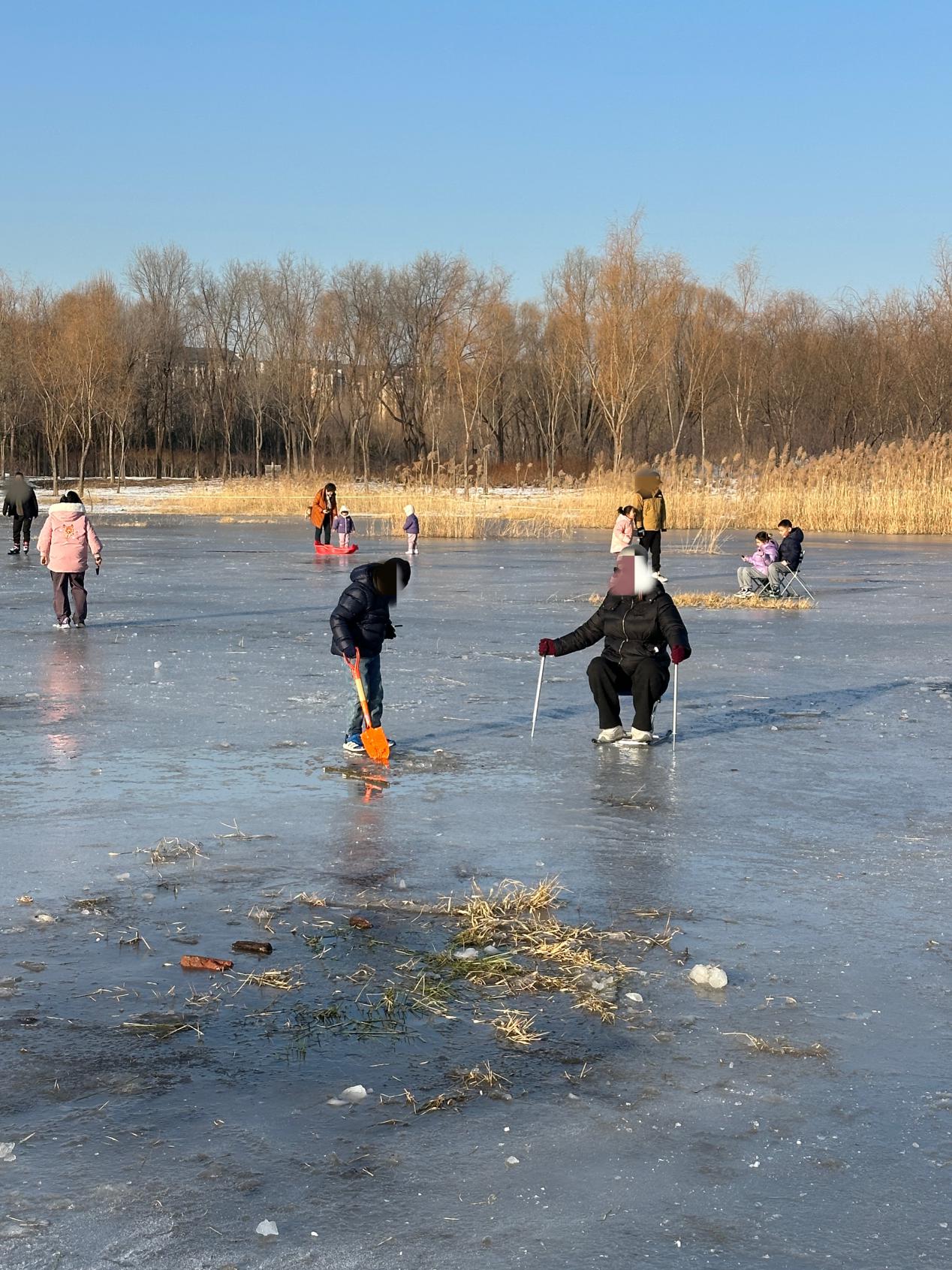 “这儿不光是水,还有湿软的泥地,冻不瓷实!咱们去东区,那块背阴,应该结实点。”另一位带着冰刀、本想陪女儿滑冰的家长,试了试觉得不安全,决定转移“阵地”。