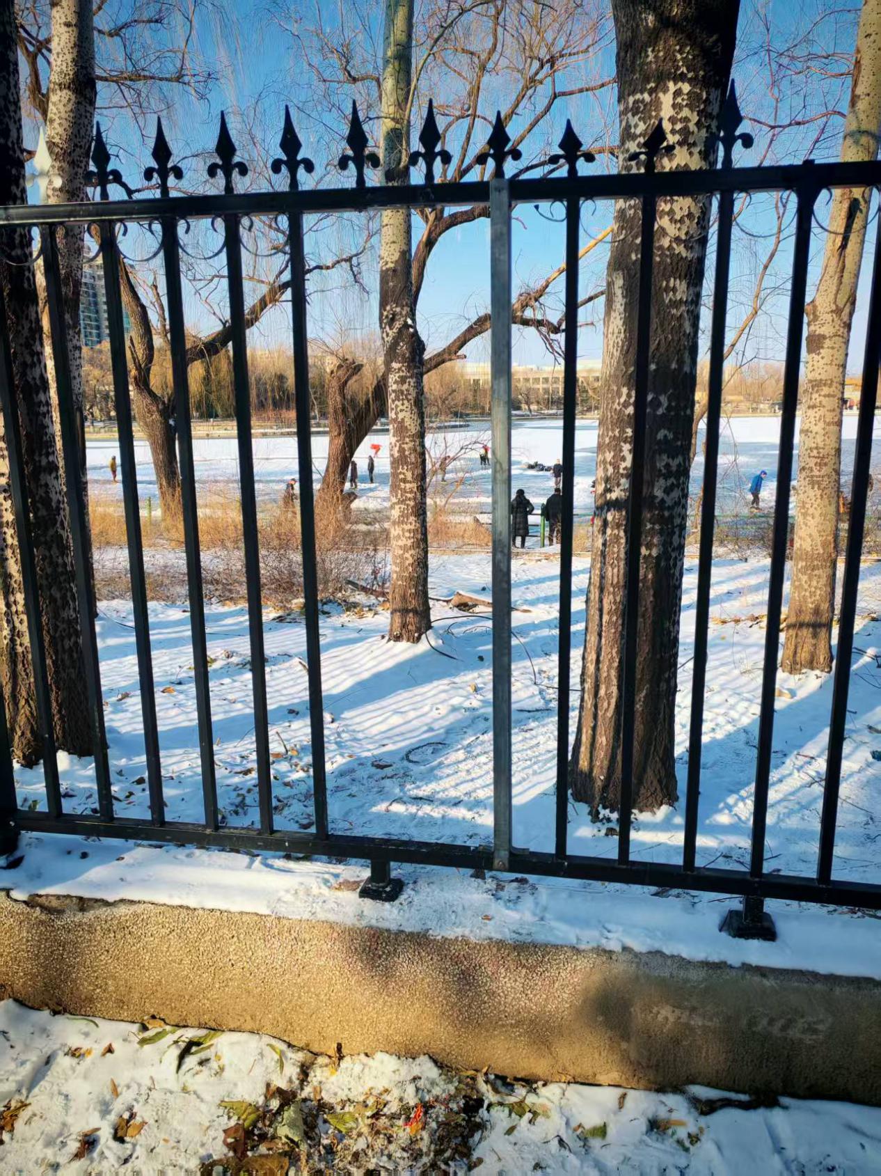 “早上7点就来人了,一直到晚上10点才散,赶不走。”保安说,他们轮流换班,始终保持两个人在湖边值守,生怕出意外。正说着,远处一个滑冰者,背着包、举着冰球杆,费了九牛二虎之力从铁栅栏侧面爬了过去。在记者走访期间,不断看到有人穿越铁栅栏,走上冰面。