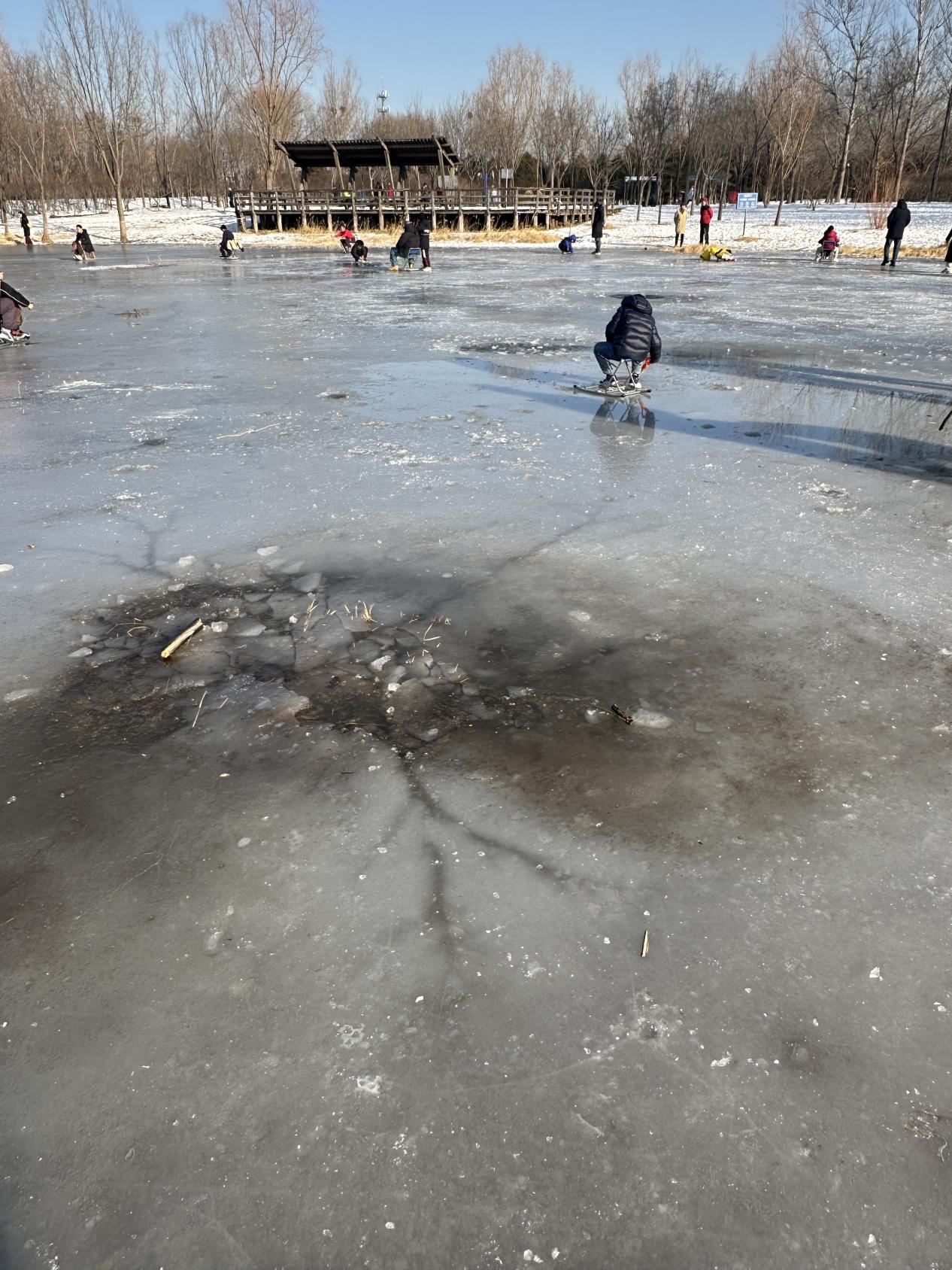 这是上周六下午2点,朝阳公园的这一块湖面,还没有完全冻上,站在岸边就能清楚地看到冰面中露出的湖水。滑冰的人群有二三十人,而且人数还在不断上升。有人在速滑,有人在玩冰球,有人原地旋转,还有人坐在冰车上拍照。