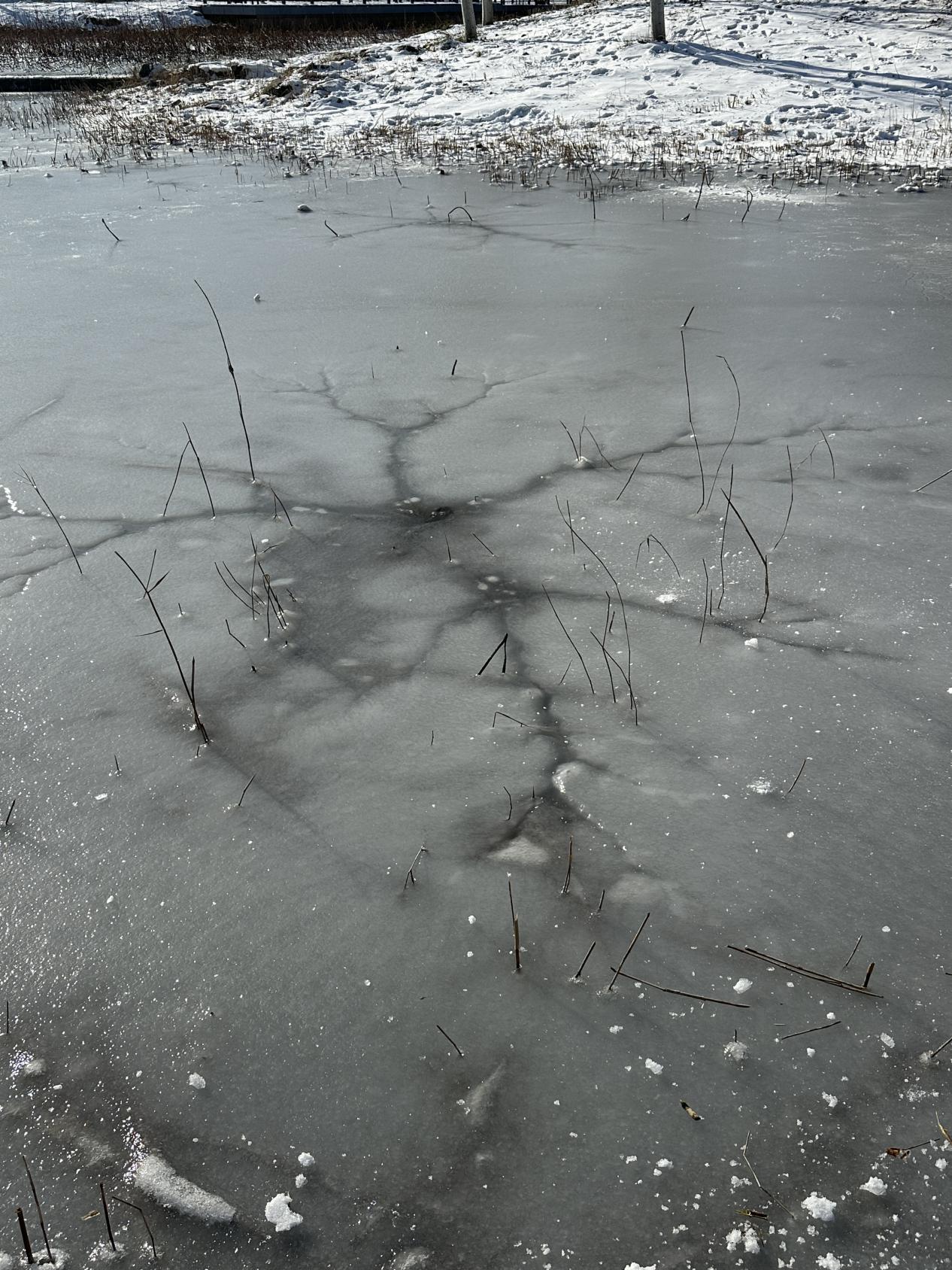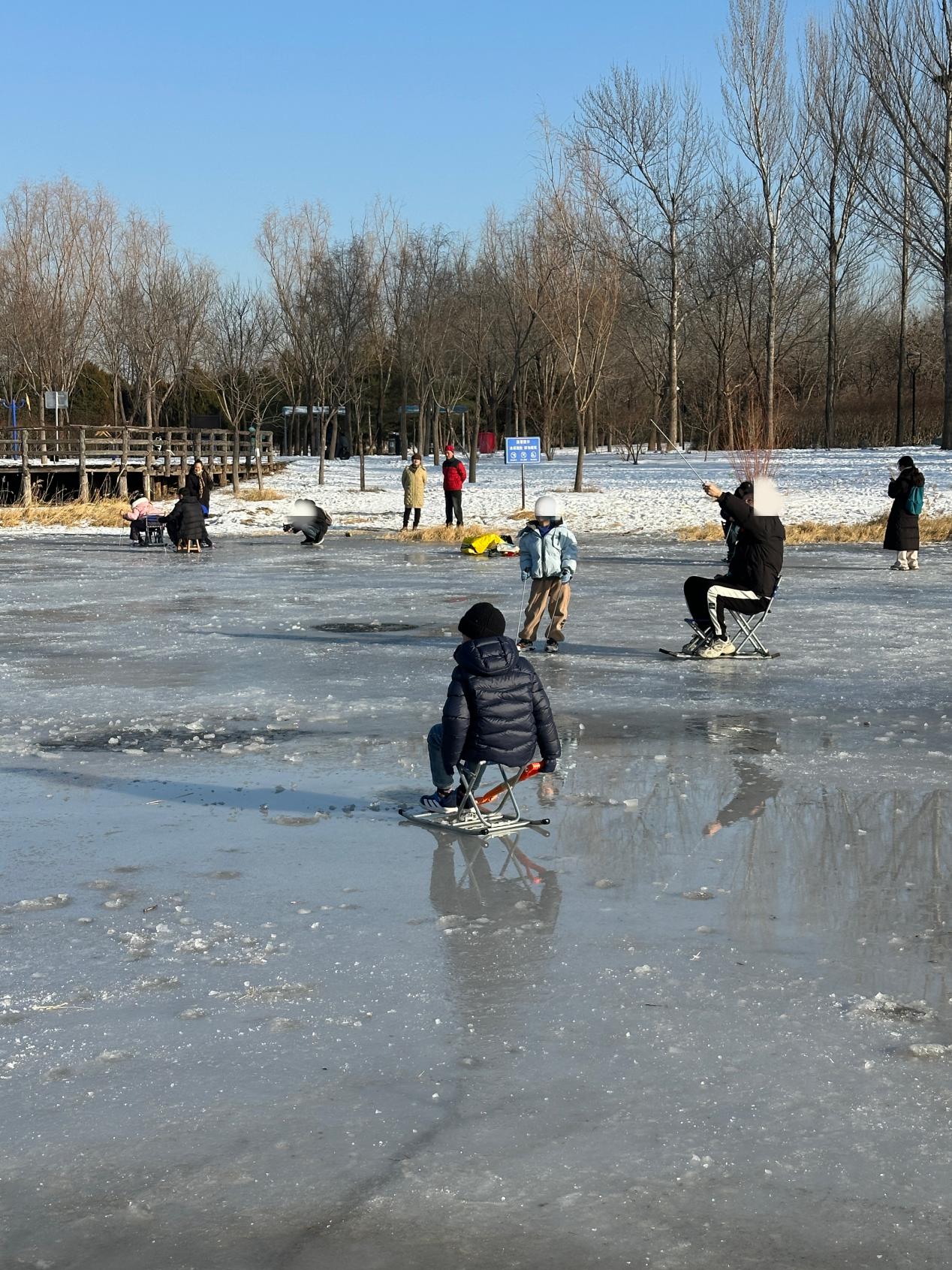 记者也来到东区,但这里并非完全背阴,正午时分,暖阳洒落冰面,可以看到几处浮着碎冰的冰窟窿。一位家长拿着半米多长的冰叉,从一个冰窟窿里向下探去,却始终没触底,随后他又找来一根一米多长的木棍向下测试,“你看,这儿得1米多深呢!你要是掉下去了,能没过身子!”这位家长开玩笑似的跟正在滑冰车的儿子说道。他的一番话引来儿子好奇,男孩用冰叉又猛戳冰窟窿边缘,冰裂声阵阵响起,但明知危险的父亲并未上前阻止。