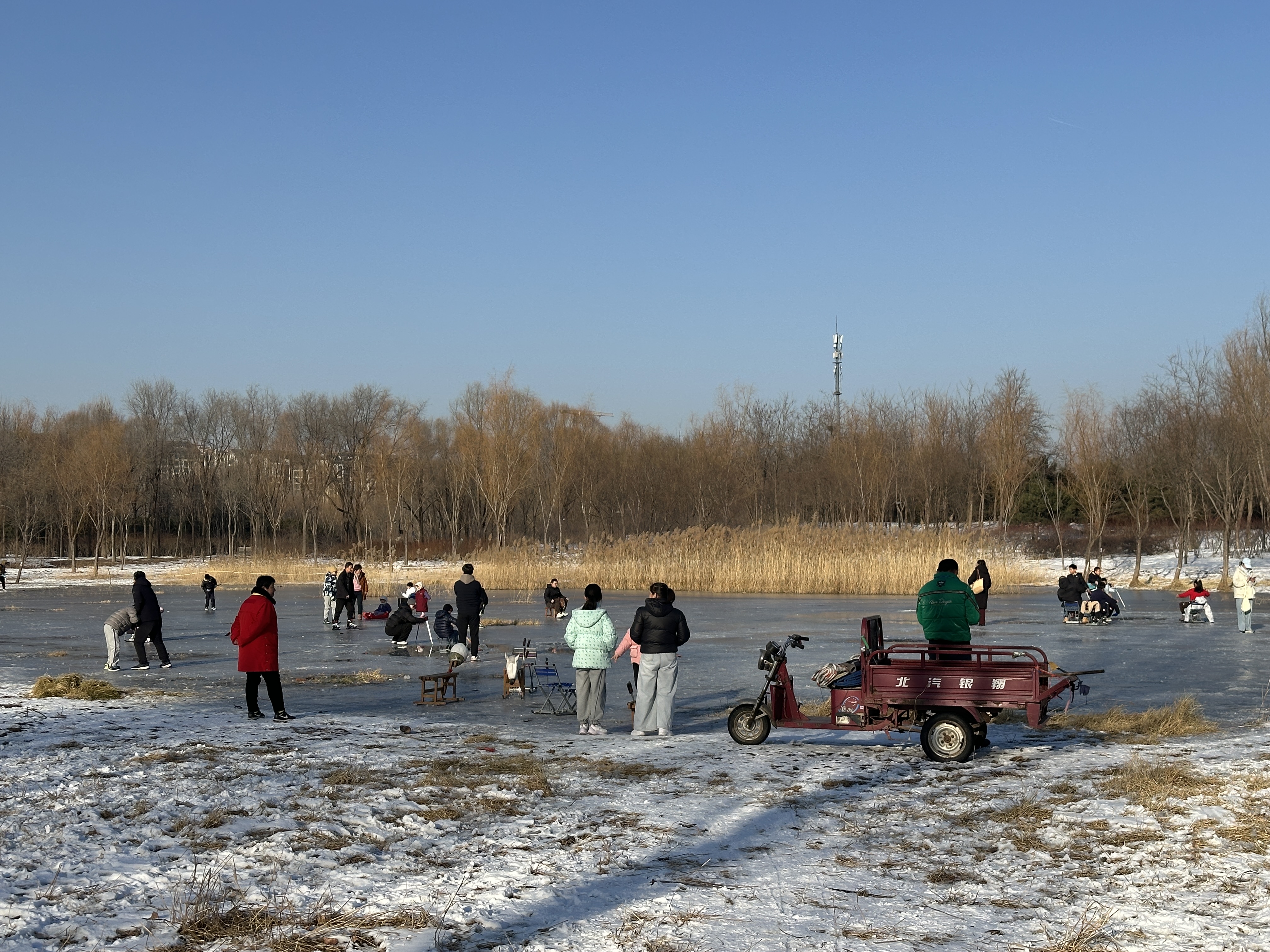 这名商贩还表示,他只浇筑了南侧这块水域,再往北边,拉着警戒线处的芦苇荡区域,他没处理。“那边水稍微深点,大概50厘米,冰面薄,不往那边走就是了。”话虽如此,仍有玩得兴起的孩子不断向芦苇荡方向试探,只有家长上前询问时,才随口提醒一句“还是到这边玩”。