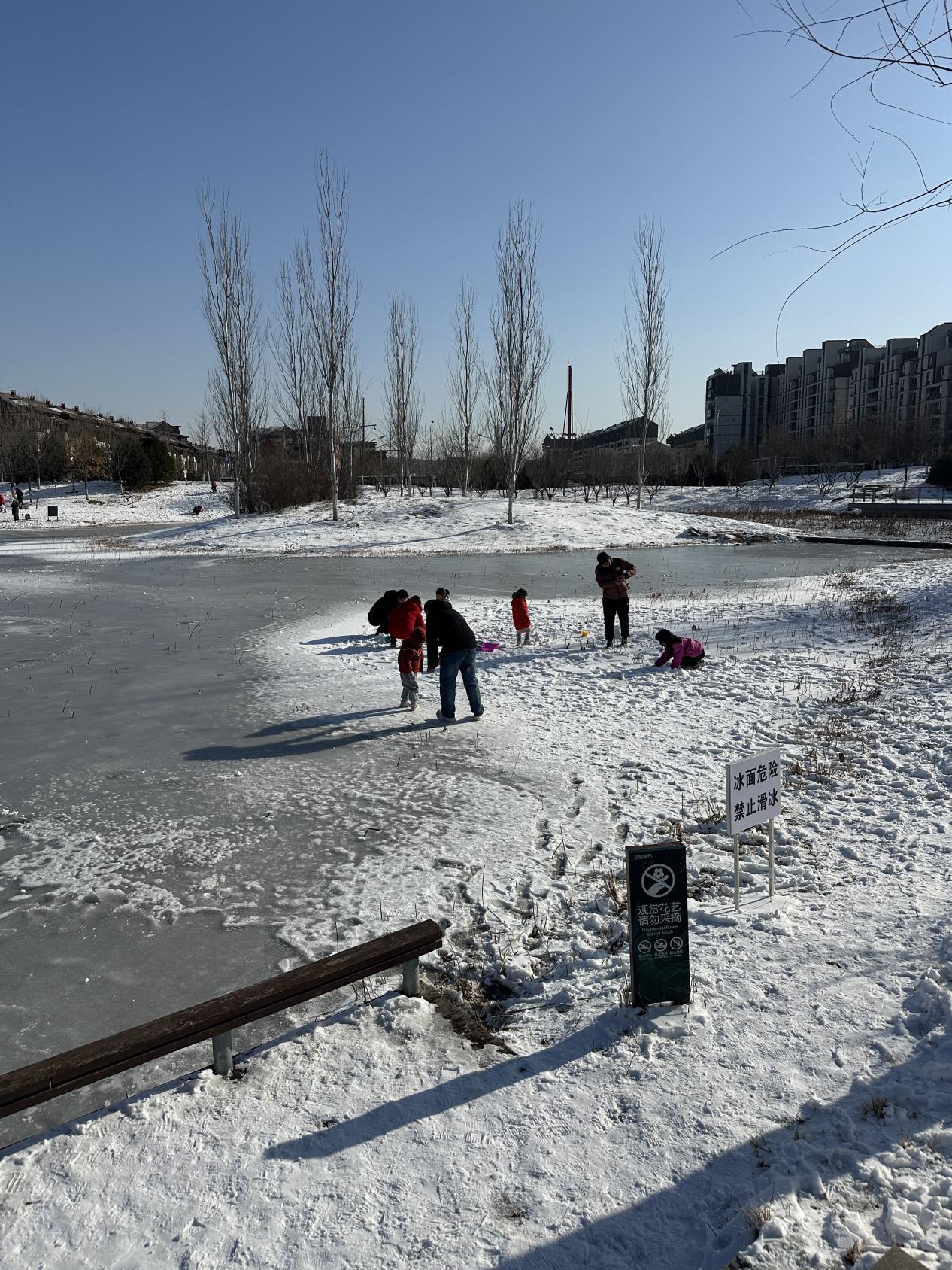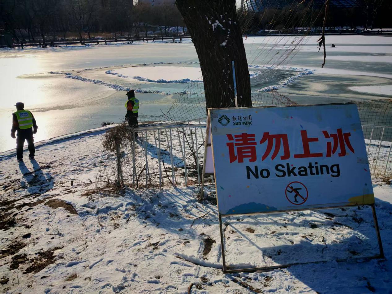 高音喇叭的声音此时足够清晰:“尊敬的游客朋友们,欢迎您来到朝阳公园,公园湖面冰层较薄,为了您的安全,请您不要在冰面行走、游玩……”