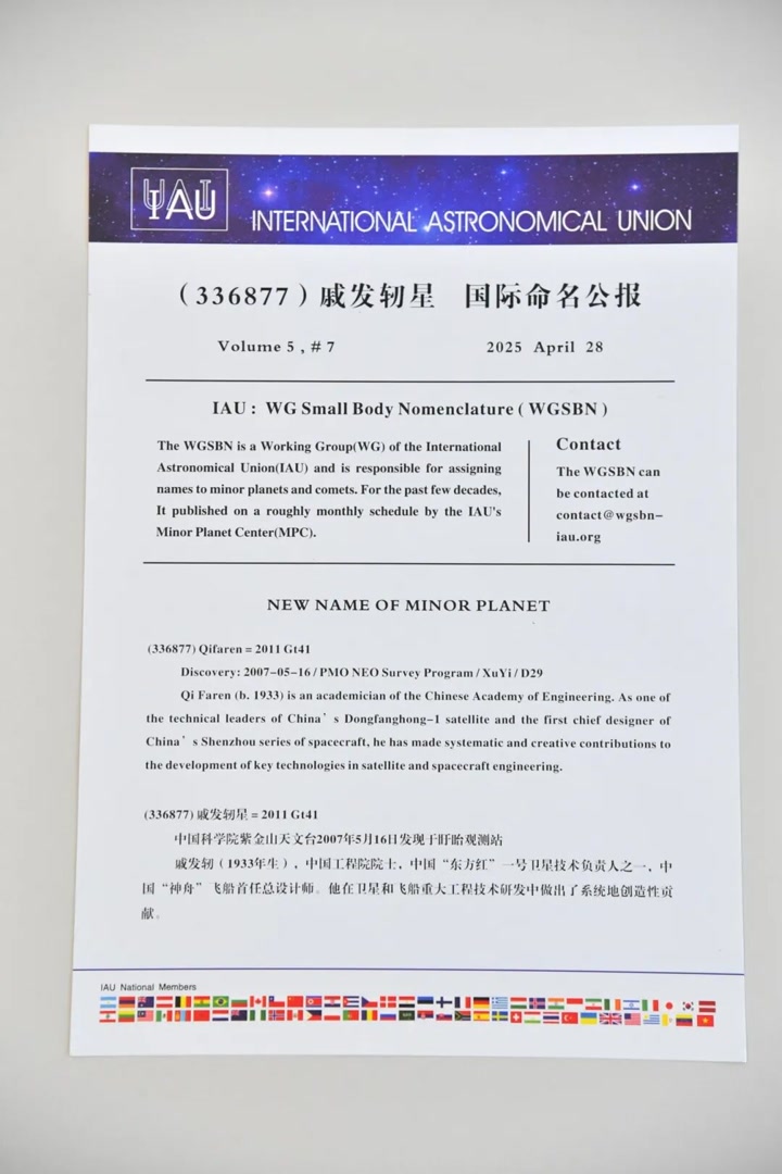 12月17日,“戚发轫星”命名仪式在中国空间技术研究院举行。由中国科学院紫金山天文台发现的、国际编号336877号的小行星,经国际天文学联合会批准,被正式命名为“戚发轫星”。太空中增添一颗属于中国航天事业的“永恒之星”。