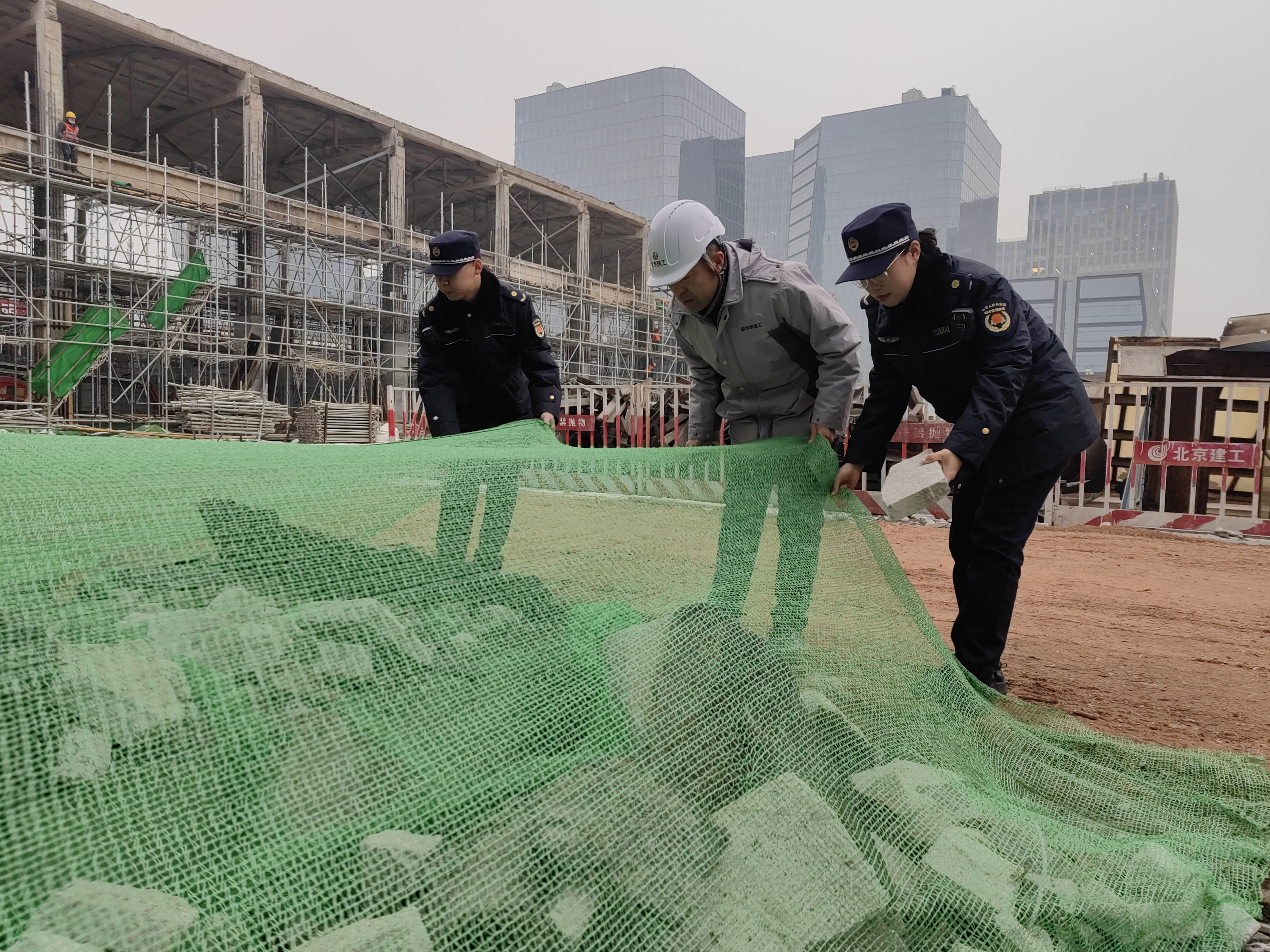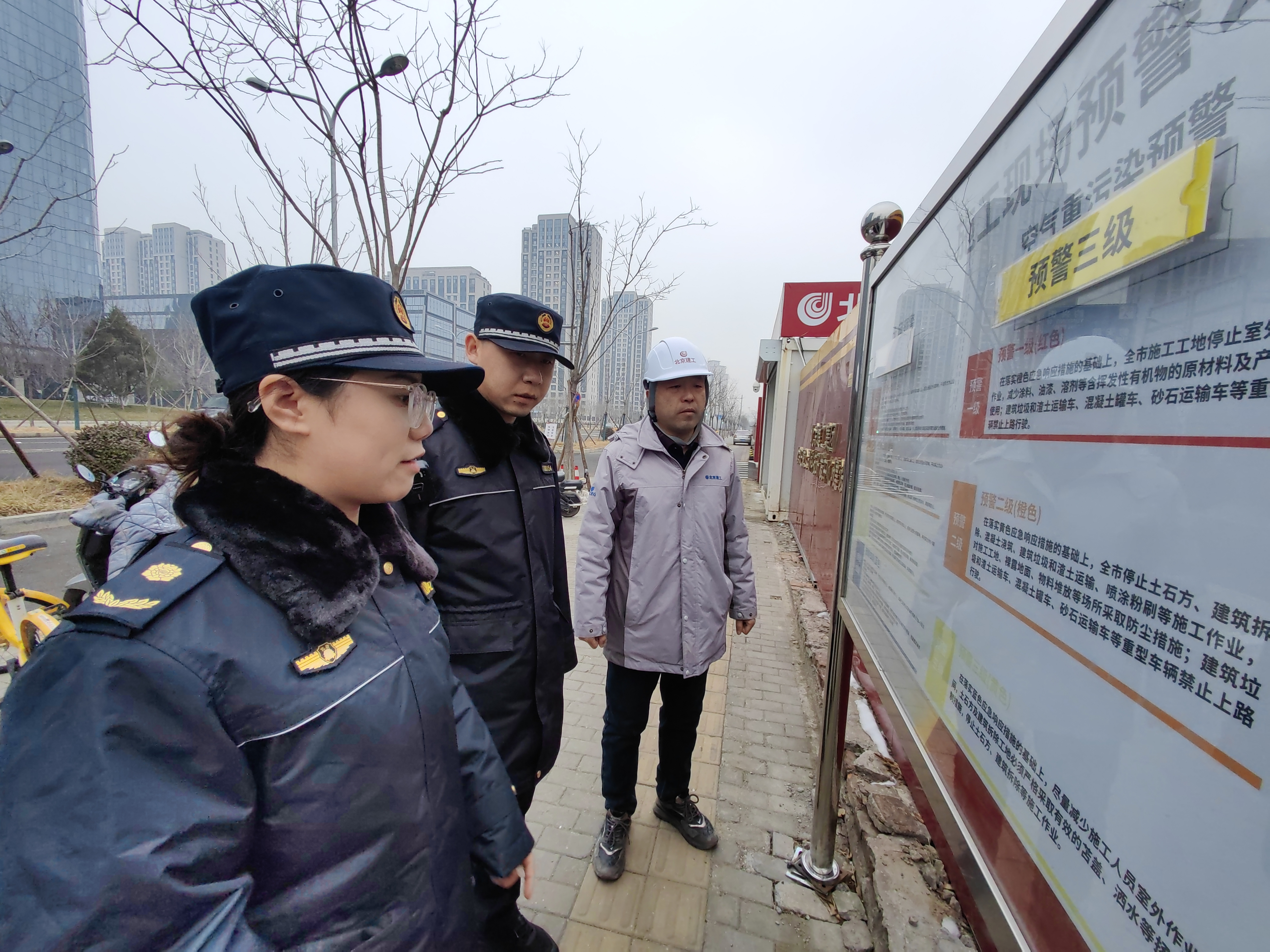 在某施工工地现场,执法人员对照空气重污染黄色预警应急响应要求,重点检查工地是否严格落实扬尘防控“六个百分百”措施,是否暂停土方开挖、渣土运输、建筑拆除等扬尘较大作业,同时对裸露土方苫盖、车辆冲洗设施使用等情况进行逐一核查。执法人员要求工地负责人强化主体责任意识,空气重污染期间安排专人盯守现场,确保各项抑尘措施落实到位。