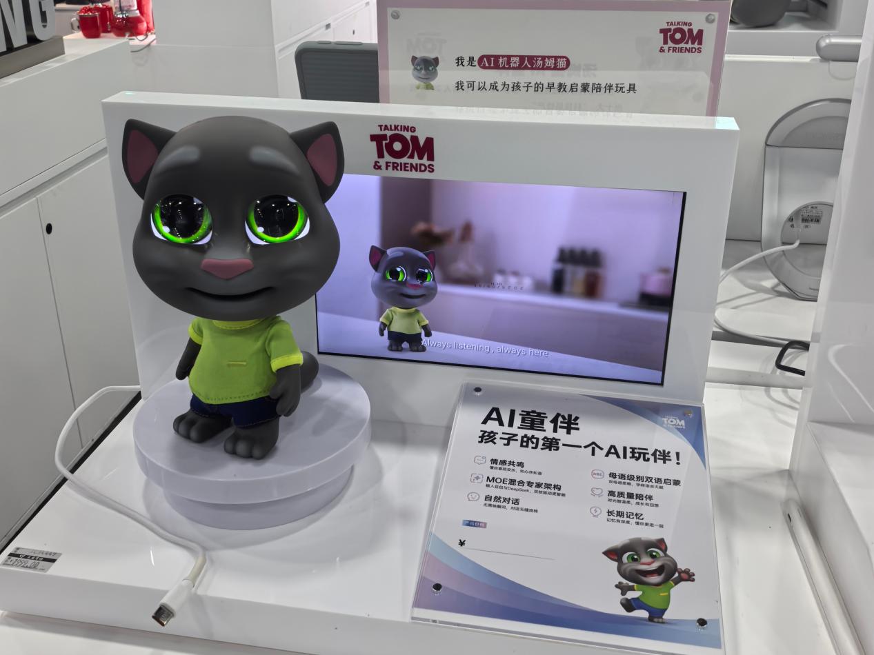 不远处,另一款售价1999元的汤姆猫AI玩具看起来更加活泼。“说话时嘴巴会动,眼神也可以根据情绪有变化,跟人对话很自然。”说罢,店员又向记者介绍了旁边一款售价3299元的宠物机器狗,“这款互动能力非常强,能跟人玩游戏,前面带摄像头,支持智能跟随,比养一只真宠物省心多了。”