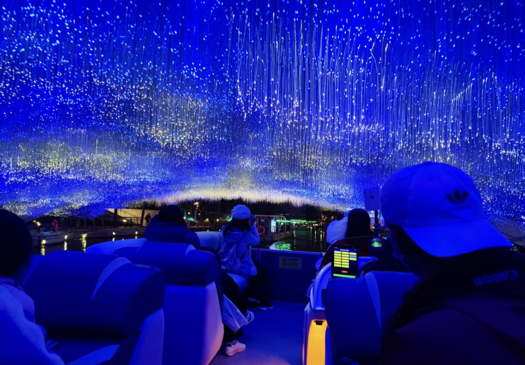 家住朝阳的刘红,周末总是要想方设法找地方遛娃。今年10月初,她通过朝阳文旅的公众号,成功预约到了亮马河国际风情水岸的免费船票,带着女儿一起在船上观看了空中光影表演。当看到鲲鹏光影装置缓缓飞升、表演者凌空起舞时,船上的游客都非常兴奋。刘红说,自己平时很少坐船,如今有个免费的机会在亮马河中漫游,欣赏流光溢彩的水幕光影,感受沿途的星光灯串,实在让人大饱眼福。
