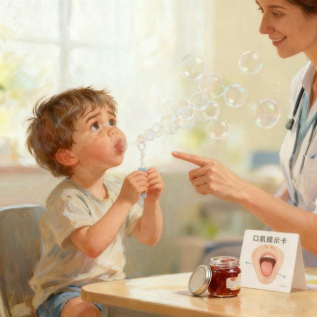 在我们的303诊室,治疗师为小明制定了一套个性化的口肌与构音训练方案。这个过程,更像是一场有趣的“口腔运动游戏”: