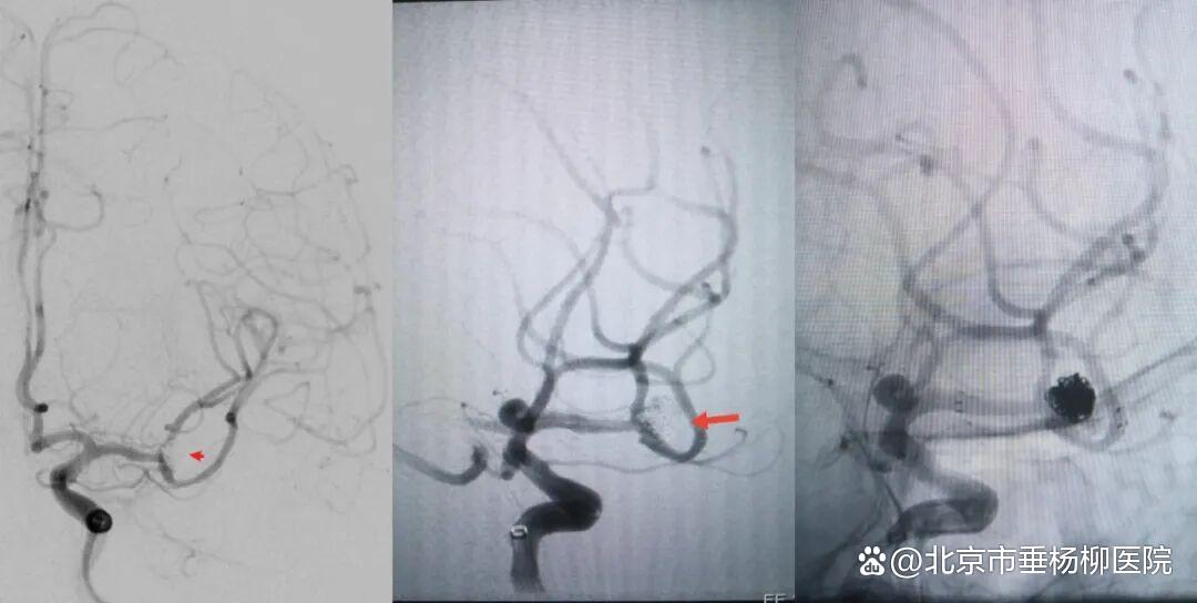 ▲术后DSA显示动脉瘤致密栓塞,载瘤动脉通畅