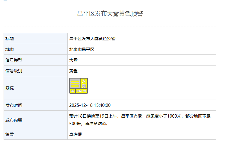 12月18日15:40,昌平区发布大雾黄色预警