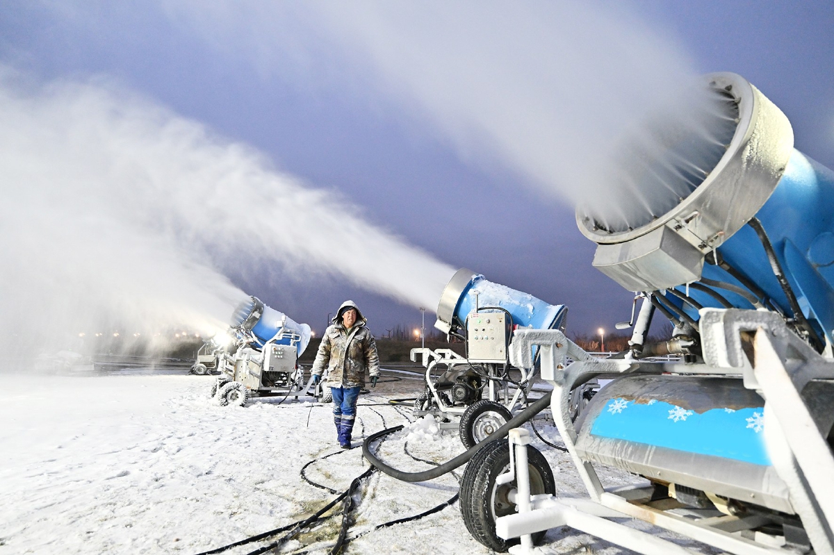 7台造雪机同时开机工作,雪花落满雪场。记者 常鸣/摄
