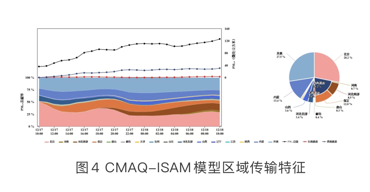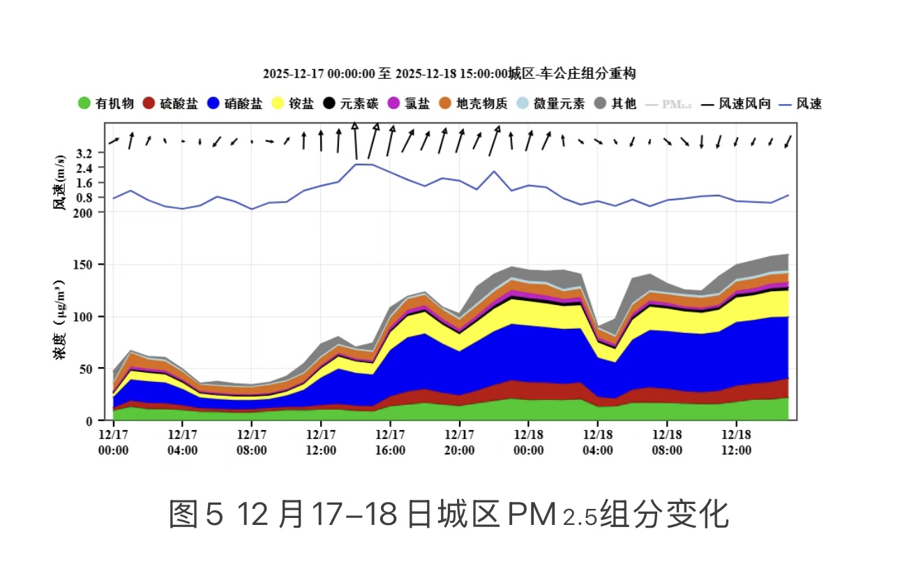 而在北京PM2.5组分中硝酸盐占比突出,说明移动源贡献较大。在污染过程期间,17日夜间至18日白天,城区PM2.5组分中硝酸盐、铵盐、硫酸盐均值占比分别为39%、16%、11%,二次组分占比超六成,二次污染特征显著。其中硝酸盐占比最高,接近四成,对PM2.5浓度贡献突出,这表明北京本地仍需强化移动源等污染排放控制。