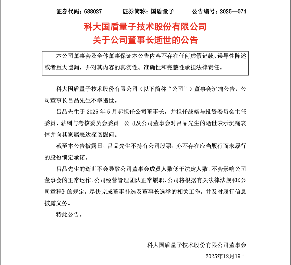 国盾量子发布公告:公司董事长吕品不幸逝世