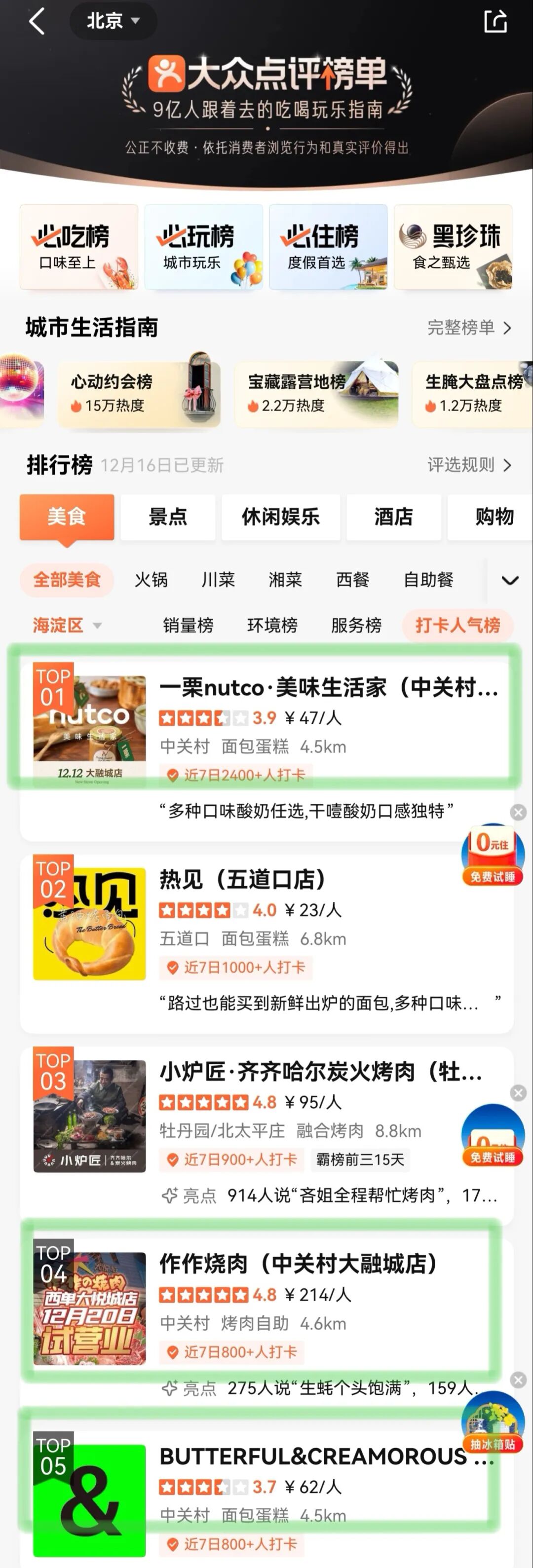 海淀区美食打卡人气榜上