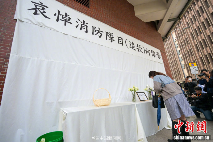 12月19日上午,香港消防处为在大埔火灾中殉职的消防员何伟豪举行最高荣誉丧礼。记者在现场所见,灵堂中央挂着何伟豪身穿消防制服的遗照,上方横匾写有“浩气长存”四字。灵堂中央摆放着何伟豪未婚妻的心形花牌,上面写着:“痛彻心扉 不思量 自难忘”,何伟豪兄长及弟弟的花牌放在两侧,分别写着“折翼之痛”和“痛失手足”。