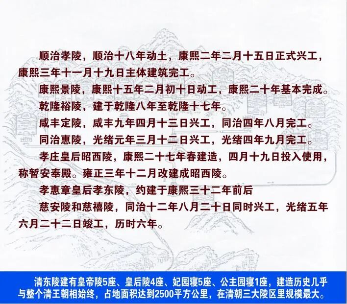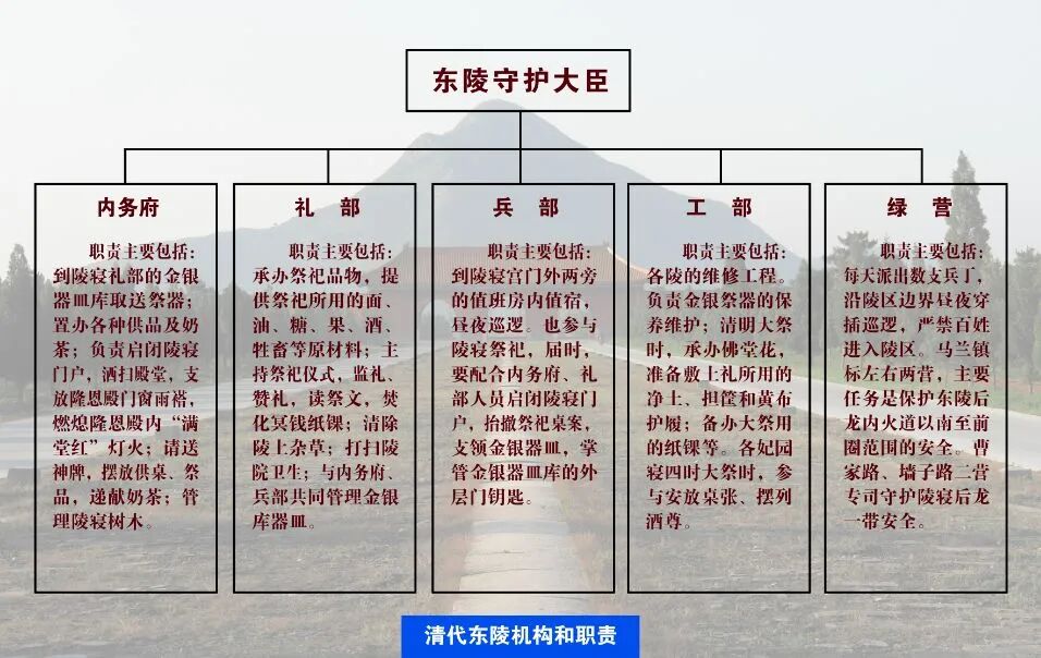 清东陵共有帝、后陵九座,妃园寝五座。陵区的前圈、后龙都是风水禁地,里边不许百姓进入。清朝为了保护陵寝和风水禁地,有效地管理陵寝,进行祭祀活动,在每建一陵时,兵部、礼部、内府三系统的营房同时营建,各自单成一体。绿营则是按军制单位建立营房。