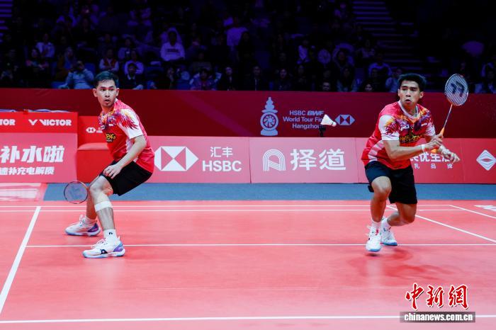 12月18日,2025汇丰世界羽联世界巡回赛总决赛在浙江杭州举行。在男双小组赛A组比赛中,韩国组合金元昊/徐承宰2比0战胜印度尼西亚组合咖塔曼/伊斯法哈尼。图为咖塔曼(右)/伊斯法哈尼在比赛中。中新社记者 肖健 摄