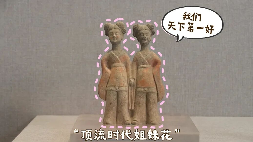 洛阳博物馆的北魏彩绘陶牵手女佣,出土自洛阳市宜阳县马窑村杨机墓,与常见的陶俑不同,这件陶俑由两人组成,姐俩头梳双髻,饰有花钿,身着左衽宽袖红色上衣,下着宽大喇叭形长裤,束腰带,并肩站立,手牵着手,笑容温婉、姿态亲昵,被网友称为“千年好闺蜜”。