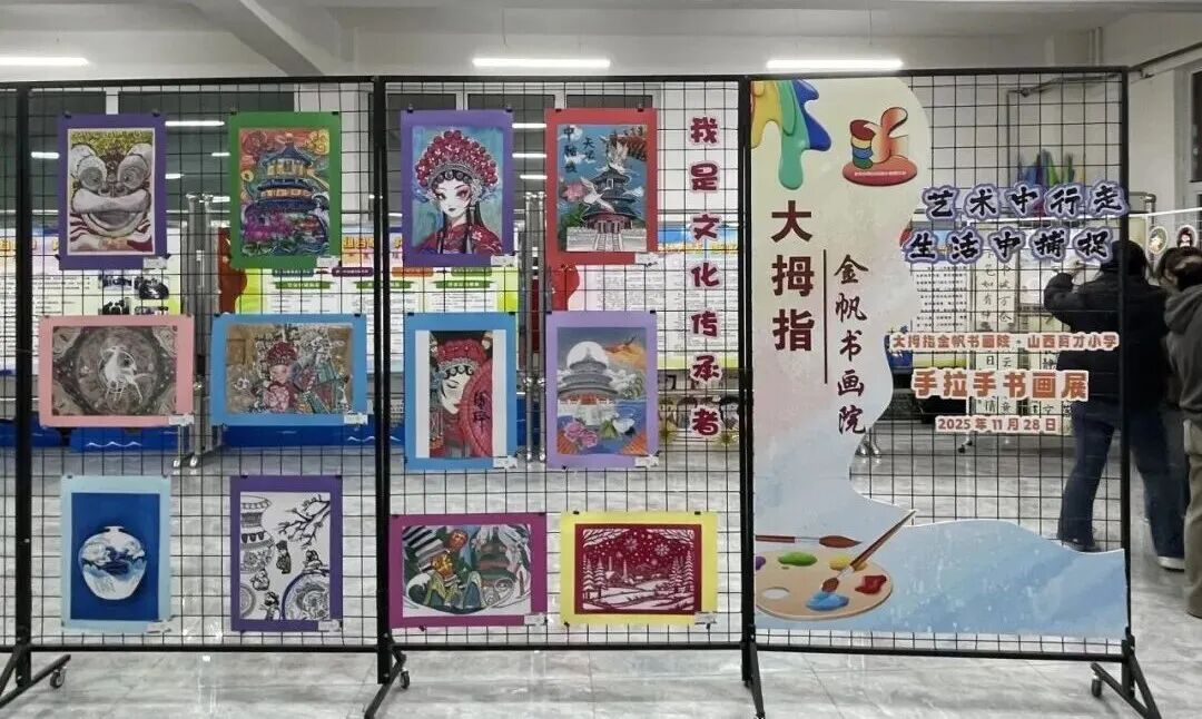 本次活动最具感染力的环节,是良乡四小大拇指金帆书画院与育才小学联合呈现的“手拉手书画展”,画展现场成为两地文化交融、童心互鉴的生动课堂。