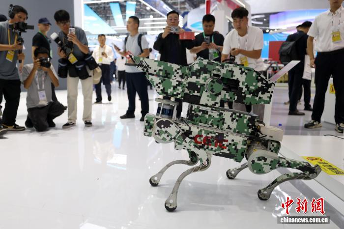 2024年11月13日,第十五届中国航展中国电子科技集团有限公司展位展出的四足机器人吸引参观者。第十五届中国国际航空航天博览会于11月12日至17日在珠海国际航展中心举行。中新社记者 富田 摄