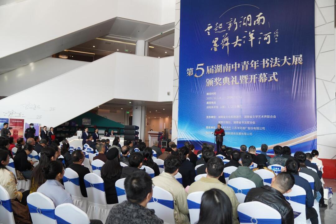12月19日上午,“云起新湖南 墨舞大洋河”第五届湖南中青年书法大展开幕式暨颁奖典礼在湖南美术馆举行。现场人气高涨,气氛热烈,展厅内外人头攒动,众多书法爱好者、文化艺术界人士及市民群众早早到场。展览集中呈现202件形式多样、内容丰富的书法作品,为观众打造了一场精彩纷呈的艺术体验。“优秀奖”作者现场接受表彰。