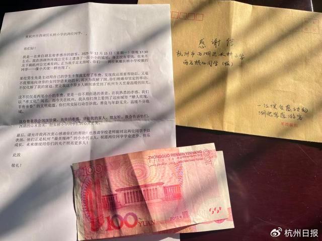 除了感谢信,黄先生还执意塞进两百元钱,作为对四元车费的补偿。对此,宓刚校长说,学校毗邻西湖,学生平时为游客指路、公交让座已是常态。“他们某种意义上也成了杭州学生文明礼仪的窗口。”为鼓励更多孩子乐于助人,学校在征求三人同意后,将这两百元纳入红领巾基金,用于奖励未来像他们一样热心善良的学生。