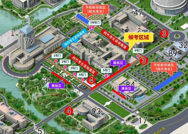 第一教学楼南、西、北侧共设置3个入场通道,上午8:00、下午1:30开启入场通道。校外考生从南、北侧通道排队有序入场,校内考生从西侧通道排队有序入场。